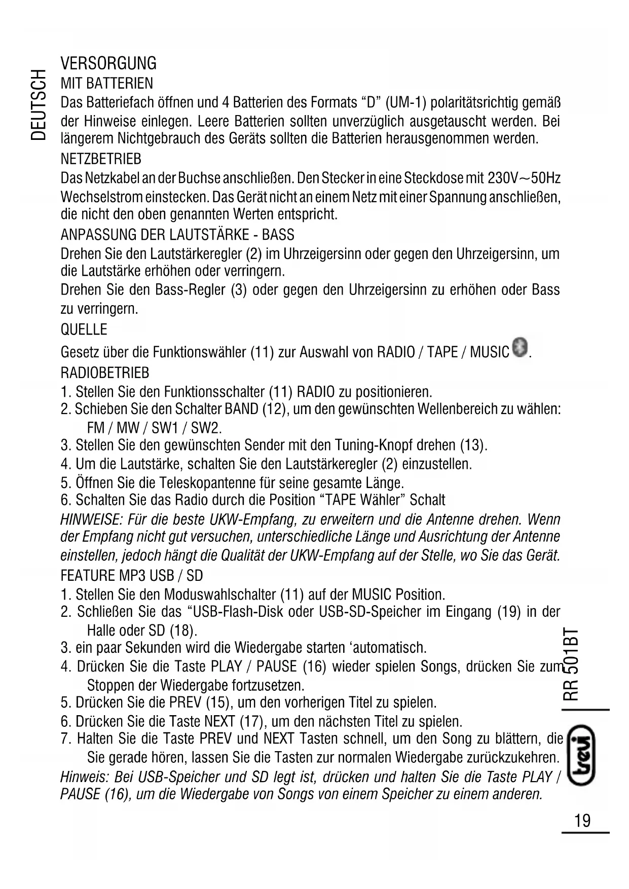 BEDIENUNGSANLEITUNG RR 501 BT Trevi