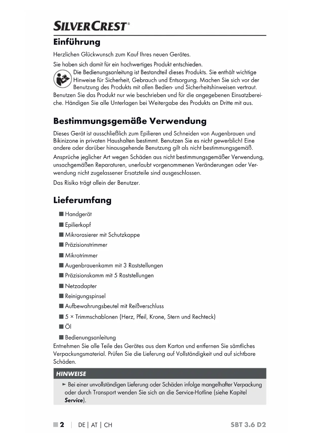 SBT 3.6 D2 - Damenrasierer SILVERCREST - Kostenlose Bedienungsanleitung