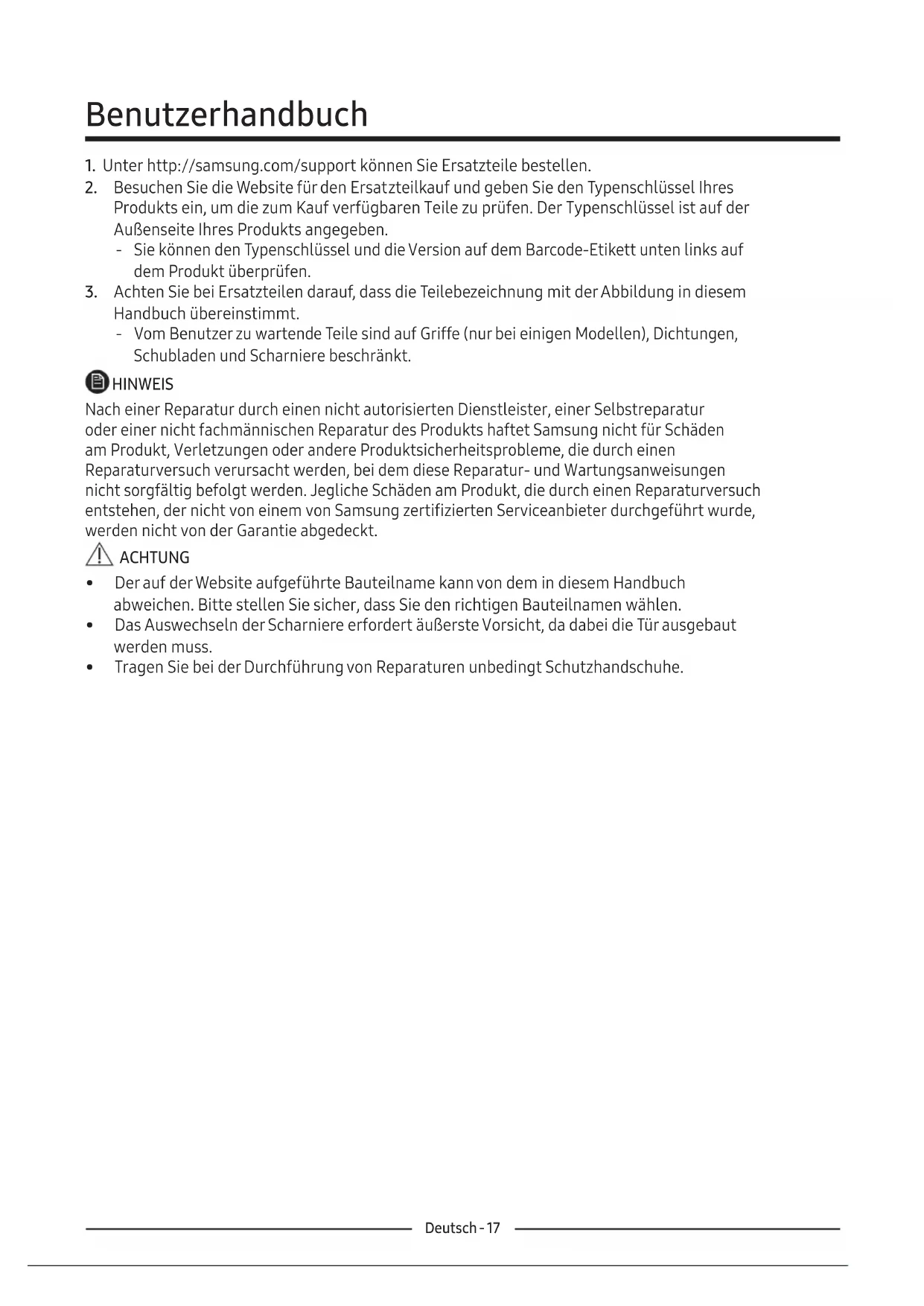 Handbuch übereinstimmt. ‐ Vom Benutzer zu wartende Teile sind auf Griffe (nur bei einigen Modellen), Dichtungen, Schubladen und Scharniere beschränkt. HINWEIS Nach einer Reparatur durch einen nicht autorisierten Dienstleister, einer Selbstreparatur oder einer nicht fachmännischen Reparatur des Produkts haftet Samsung nicht für Schäden am Produkt, Verletzungen oder andere Produktsicherheitsprobleme, die durch einen Reparaturversuch verursacht werden, bei dem diese Reparatur- und Wartungsanweisungen nicht sorgfältig befolgt werden. Jegliche Schäden am Produkt, die durch einen Reparaturversuch entstehen, der nicht von einem von Samsung zertifizierten Serviceanbieter durchgeführt wurde, werden nicht von der Garantie abgedeckt. ACHTUNG