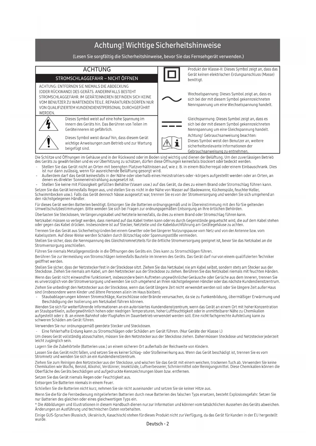 der Wand mit einem stabilen und reißfesten Kabel miteinander, das Sie dann festziehen. - Stellen Sie das Fernsehgerät in der Nähe der Wand auf, damit es nicht nach hinten kippen kann. - Achten Sie darauf, dass die Halterungen an der Wand höchstens auf derselben Höhe wie die Halterungen am Gerät liegen, wenn Sie sie mit dem Kabel miteinander verbinden. Deutsch - 12 KS8000_ZG_BN68-07862L-01_L04.indb 12 2016-05-24 2:11:03Technische Daten und weitere Informationen Technische Daten Bildschirmauflösung 3840 x 2160 Umgebungsbedingungen Temperatur (im Betrieb) Luftfeuchtigkeit (im Betrieb) Temperatur (bei Lagerung) Luftfeuchtigkeit (bei Lagerung) 10 °C bis 40 °C (50 °F bis 104 °F) 10% bis 80%, nicht kondensierend -20℃bis45℃(-4℃bis113℃) 5% bis 95%, nicht kondensierend Drehbarer Standfuß (Links / Rechts) 0˚ Modellbezeichnung UE49KS8080 / UE49KS8090 UE55KS8080 / UE55KS8090 Bildgröße (Diagonal) 49 Zoll (123 cm) 55 Zoll (138 cm) Ton (Ausgang) 60 W Abmessungen (B × H × T) Gehäuse Mit Standfuß 1094,2 x 635,8 x 42,5 mm 1094,2 x 718,5 x 354,2 mm 1230,9 x 712,3 x 40,8±3,0 mm 1230,9 x 799,5 x 376,2±3,0 mm Gewicht Ohne Standfuß Mit Standfuß 15,0 kg 17,1 kg 17,7 kg 19,9 kg Modellbezeichnung UE65KS8080 / UE65KS8090 UE75KS8080 / UE75KS8090 Bildgröße (Diagonal) 65 Zoll (163 cm) 75 Zoll (189 cm) Ton (Ausgang) 60 W Abmessungen (B × H × T) Gehäuse Mit Standfuß 1448,9 x 835,8 x 40,8 mm 1448,9 x 929,9 x 414,1 mm 1682,8 x 970,7 x 49,9 mm 1682,8 x 1071,1 x 438,9 mm Gewicht Ohne Standfuß Mit Standfuß 26,6 kg 28,8 kg 41,7 kg 46,0 kg - Änderung der technischen Daten und des Gerätedesigns vorbehalten. - Die technischen Daten zur benötigten Netzspannung und Informationen zum Energieverbrauch finden Sie auf dem Etikett am Gerät. - Der typische Stromverbrauch wird gemäß IEC 62087 gemessen. Verringern des Stromverbrauchs Wenn Sie das Gerät ausschalten, wechselt es in den Standby-Modus. Im Standby-Modus verbraucht es weiterhin eine gewisse Menge an Strom. Wenn Sie das Fernsehgerät längere Zeit nicht verwenden, sollten Sie daher den Netzstecker aus der Steckdose ziehen, um den Stromverbrauch zu senken. Deutsch Deutsch - 13 KS8000_ZG_BN68-07862L-01_L04.indb 13 2016-05-24 2:11:04Lizenzen The terms HDMI and HDMI High-Definition Multimedia Interface, and the HDMI Logo are trademarks or registered trademarks of HDMI Licensing LLC in the United States and other countries. Empfehlung - Nur EU Hiermit erklärt Samsung Electronics, dass dieses Fernsehgerät mit allen wesentlichen Anforderungen und sonstigen relevanten Bestimmungen der Richtlinie 1999/5/EG konform ist. Die offizielle Konformitätserklärung finden Sie unter http://www.samsung.com. Wechseln Sie dort zu Support > Produktsuche, und geben Sie den Modellnamen ein. Dieses Gerät ist ausschließlich für die Verwendung in geschlossenen Räumen geeignet. Dieses Gerät kann in allen Ländern in der EU verwendet werden. Deutsch - 14 KS8000_ZG_BN68-07862L-01_L04.indb 14 2016-05-24 2:11:05Ordnungsgemäße Entsorgung dieses Geräts (Elektro- & Elektronik-Altgeräte) (Anwendbar in Ländern mit Systemen zur getrennten Sammlung von Wertstoffen). Diese Kennzeichnung auf dem Gerät, dem Zubehör oder der Dokumentation bedeutet, dass das Gerät sowiedaselektronischeZubehör(z.B.Ladegerät,Headset,USB-Kabel)amEndeihrerLebensdauernicht im normalen Hausmüll entsorgt werden dürfen. Entsorgen Sie diese Geräte bitte getrennt von anderen Abfällen, um der Umwelt bzw. der menschlichen Gesundheit nicht durch unkontrollierte Müllbeseitigung zu schaden. Recyceln Sie das Gerät, um die nachhaltige Wiederverwertung von stofflichen Ressourcen zu fördern. Private Nutzer sollten den Händler, bei dem das Produkt gekauft wurde, oder die zuständigen Behörden kontaktieren, um in Erfahrung zu bringen, wie sie das Gerät auf umweltfreundliche Weise recyceln können. Gewerbliche Nutzer wenden sich an ihren Lieferanten und überprüfen die Konditionen ihres Kaufvertrags. Dieses Gerät und seine elektronischen Zubehörteile dürfen nicht zusammen mit anderem Gewerbemüll entsorgt werden. Ordnungsgemäße Entsorgung der Batterien in diesem Gerät (Anwendbar in Ländern mit Systemen zur getrennten Sammlung von Wertstoffen). Diese Kennzeichnung auf der Batterie, dem Handbuch oder der Verpackung bedeutet, dass die Batterien am Ende ihrer Lebensdauer nicht im normalen Hausmüll entsorgt werden dürfen. Die Kennzeichnung mit den chemischen Symbolen „Hg“, „Cd“ oder „Pb“ bedeutet, dass die Batterie Quecksilber, Cadmium oder Blei in Mengen enthält, die die Grenzwerte der EU-Direktive 2006/66 übersteigen. Wenn Batterien nicht ordnungsgemäß entsorgt werden, können diese Substanzen die Gesundheit von Menschen oder die Umwelt gefährden. Zum Schutz der natürlichen Ressourcen und zur Förderung der Wiederverwertung von Materialien trennen Sie die Batterien von anderem Müll, und führen Sie sie Ihrem örtlichen Recyclingsystem zu. InformationenzumSamsungUmweltversprechenunddenproduktspezifischengesetzlichenPflichten(z.B.REACH,WEEE, Batterien) erhalten Sie auf http://www.samsung.com/uk/aboutsamsung/samsungelectronics/corporatecitizenship/data_ corner.html ACHTUNG: SORGEN SIE DAFÜR, DASS DAS GERÄT NIEMALS IN DIE NÄHE VON KERZEN, OFFENEM FEUER ODER SONSTIGEN GEGENSTÄNDEN MIT OFFENEN FLAMMEN GELANGT. ANDERNFALLS BESTEHT BRANDGEFAHR. Deutsch Deutsch - 15 KS8000_ZG_BN68-07862L-01_L04.indb 15 2016-05-24 2:11:06Avertissement! Consignes de sécurité importantes (Veuillez lire les consignes de sécurité avant d'utiliser le téléviseur.) ATTENTION ProduitdeclasseII:cesymboleindiquequ'aucun branchement de sécurité à la terre (prise de terre) n'est requis.