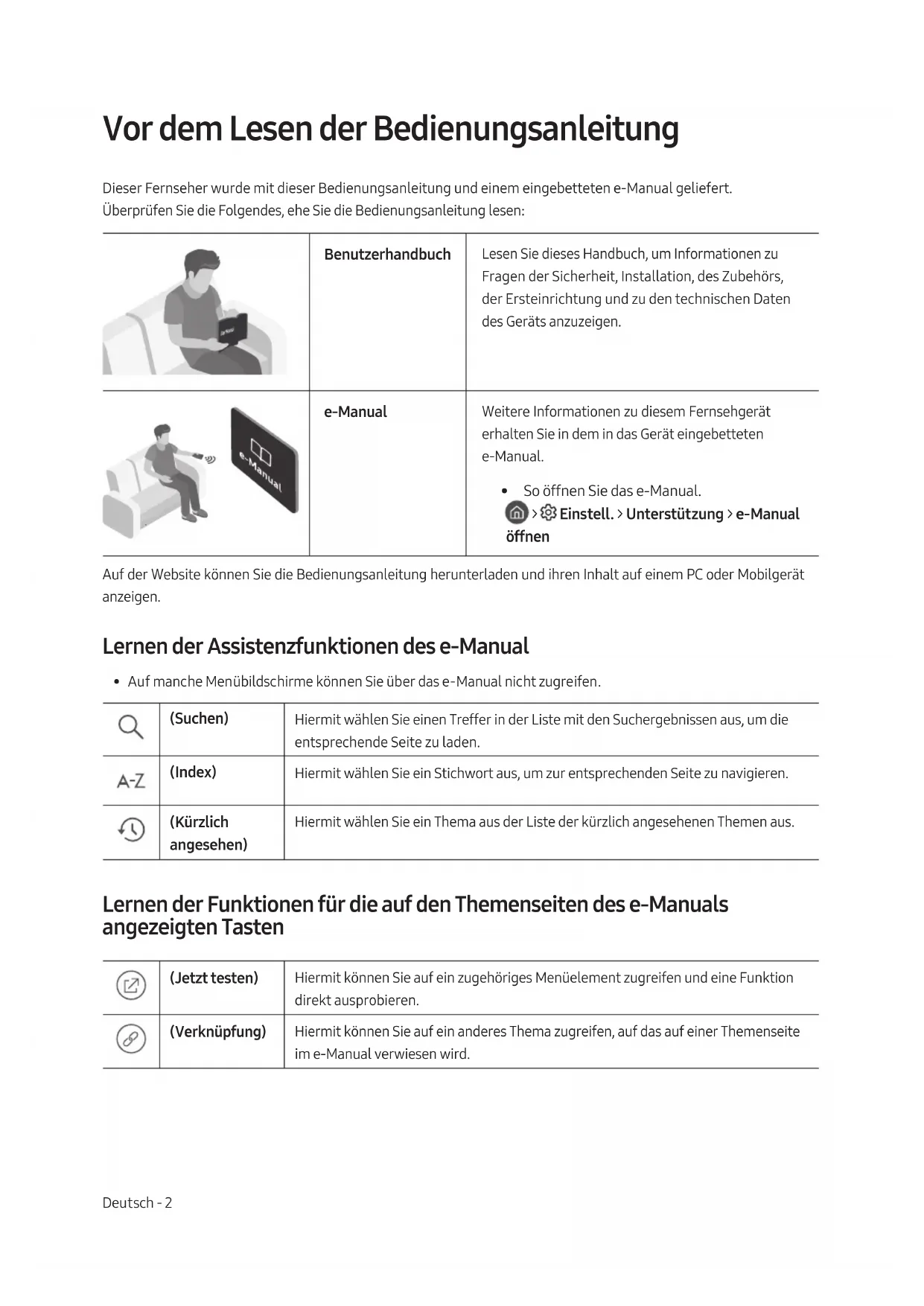 - So öffnen Sie das e-Manual. > Einstell. > Unterstützung > e-Manual öffnen Auf der Website können Sie die Bedienungsanleitung herunterladen und ihren Inhalt auf einem PC oder Mobilgerät anzeigen. Lernen der Assistenzfunktionen des e-Manual