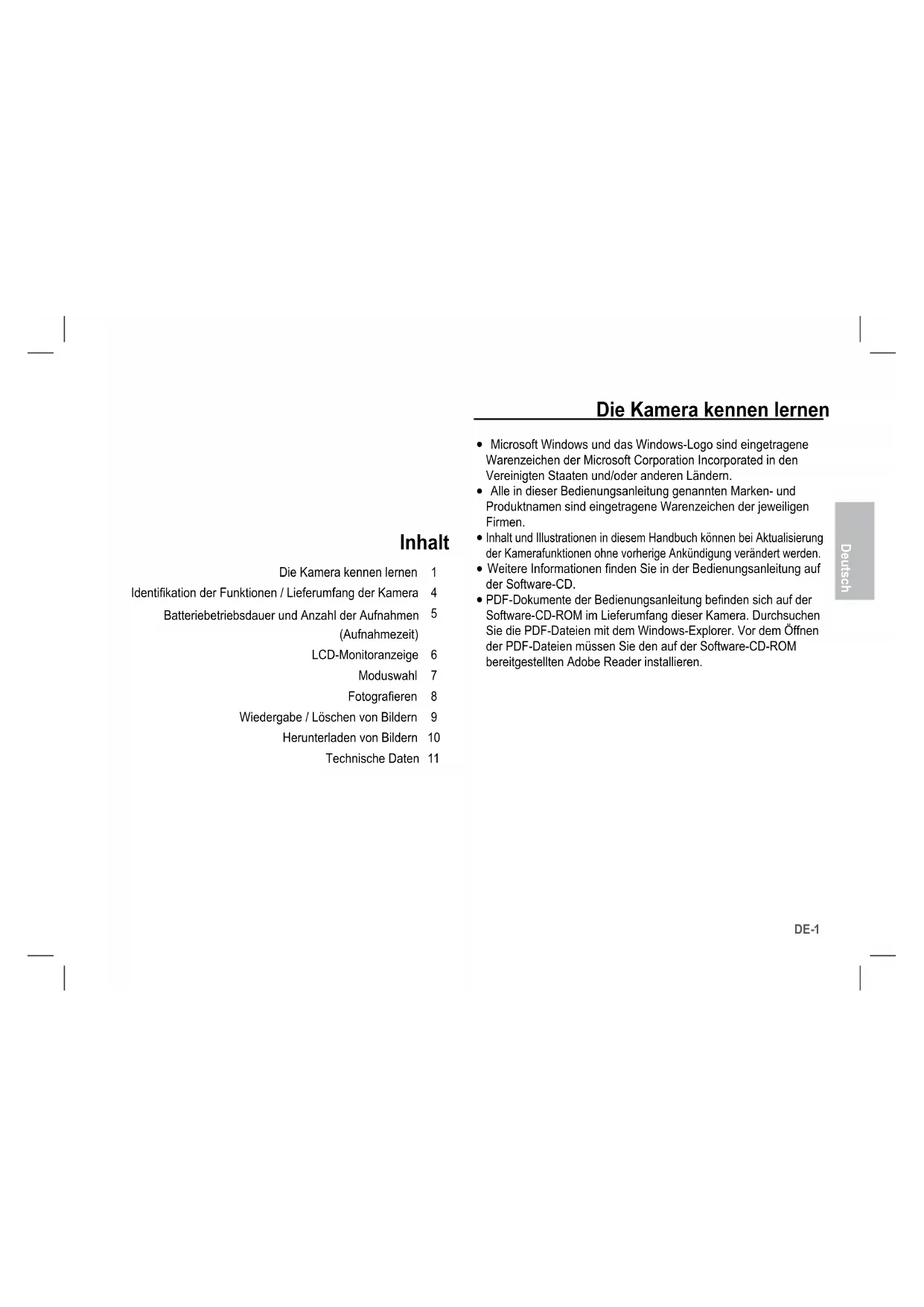 MEMO16 MEMODeutsch DE-1 Die Kamera kennen lernen Identikation der Funktionen / Lieferumfang der Kamera Batteriebetriebsdauer und Anzahl der Aufnahmen (Aufnahmezeit) LCD-Monitoranzeige Moduswahl Fotograeren Wiedergabe / Löschen von Bildern Herunterladen von Bildern Technische Daten
