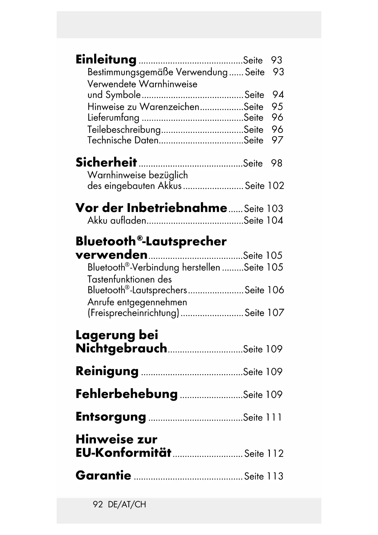 -Lautsprechers ....................... Seite 106 Anrufe entgegennehmen (Freisprecheinrichtung) .......................... Seite 107 Lagerung bei Nichtgebrauch ...............................Seite 109 Reinigung ..........................................Seite 109 Fehlerbehebung ..........................Seite 109 Entsorgung .......................................Seite 111 Hinweise zur EU-Konformität ............................. Seite 112 Garantie .............................................Seite 11393 DE/AT/CH Bluetooth