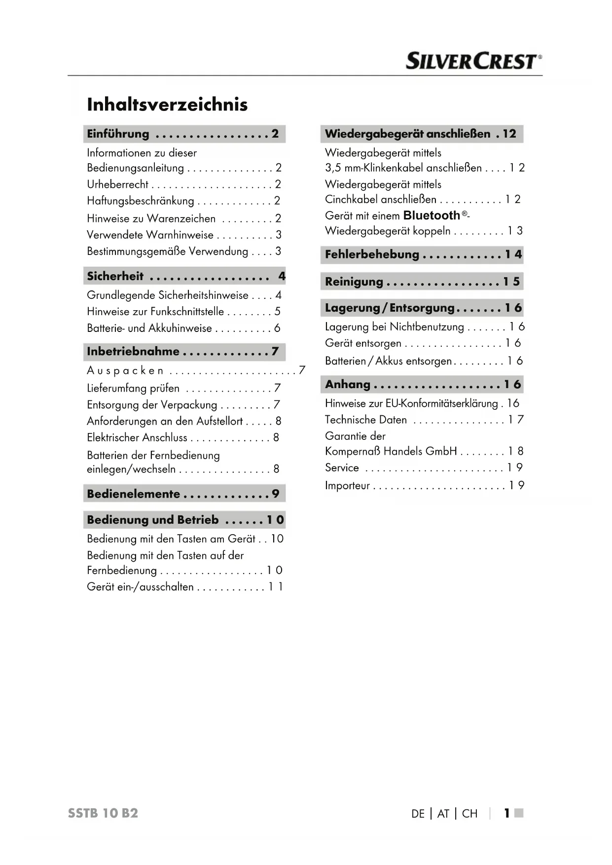 Laden Sie die Anleitung für Ihr Lautsprecher kostenlos im PDF-Format! Finden Sie Ihr Handbuch SSTB 10 B2 - SILVERCREST und nehmen Sie Ihr elektronisches Gerät wieder in die Hand. Auf dieser Seite sind alle Dokumente veröffentlicht, die für die Verwendung Ihres Geräts notwendig sind. SSTB 10 B2 von der Marke SILVERCREST.