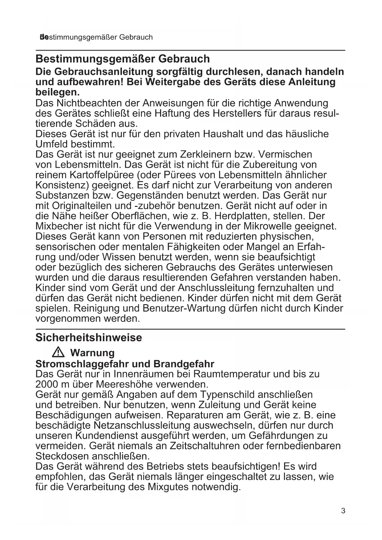 Bestimmungsgemäßer Gebrauch Bestimmungsgemäßer Gebrauch Die Gebrauchsanleitung sorgfältig durchlesen, danach handeln und aufbewahren! Bei Weitergabe des Geräts diese Anleitung beilegen. Das Nichtbeachten der Anweisungen für die richtige Anwendung des Gerätes schließt eine Haftung des Herstellers für daraus resul- tierende Schäden aus. Dieses Gerät ist nur für den privaten Haushalt und das häusliche Umfeld bestimmt. Das Gerät ist nur geeignet zum Zerkleinern bzw. Vermischen von Lebensmitteln. Das Gerät ist nicht für die Zubereitung von reinem Kartoffelpüree (oder Pürees von Lebensmitteln ähnlicher Konsistenz) geeignet. Es darf nicht zur Verarbeitung von anderen Substanzen bzw. Gegenständen benutzt werden. Das Gerät nur mit Originalteilen und -zubehör benutzen. Gerät nicht auf oder in die Nähe heißer Oberflächen, wie z. B. Herdplatten, stellen. Der Mixbecher ist nicht für die Verwendung in der Mikrowelle geeignet. Dieses Gerät kann von Personen mit reduzierten physischen, sensorischen oder mentalen Fähigkeiten oder Mangel an Erfah- rung und/oder Wissen benutzt werden, wenn sie beaufsichtigt oder bezüglich des sicheren Gebrauchs des Gerätes unterwiesen wurden und die daraus resultierenden Gefahren verstanden haben. Kinder sind vom Gerät und der Anschlussleitung fernzuhalten und dürfen das Gerät nicht bedienen. Kinder dürfen nicht mit dem Gerät spielen. Reinigung und Benutzer-Wartung dürfen nicht durch Kinder vorgenommen werden. Sicherheitshinweise W Warnung Stromschlaggefahr und Brandgefahr Das Gerät nur in Innenräumen bei Raumtemperatur und bis zu 2000 m über Meereshöhe verwenden. Gerät nur gemäß Angaben auf dem Typenschild anschließen und betreiben. Nur benutzen, wenn Zuleitung und Gerät keine Beschädigungen aufweisen. Reparaturen am Gerät, wie z. B. eine beschädigte Netzanschlussleitung auswechseln, dürfen nur durch unseren Kundendienst ausgeführt werden, um Gefährdungen zu vermeiden. Gerät niemals an Zeitschaltuhren oder fernbedienbaren Steckdosen anschließen. Das Gerät während des Betriebs stets beaufsichtigen! Es wird empfohlen, das Gerät niemals länger eingeschaltet zu lassen, wie für die Verarbeitung des Mixgutes notwendig.4 de Sicherheitshinweise Das Netzkabel nicht mit heißen Teilen in Berührung bringen oder über scharfe Kanten ziehen. Das Grundgerät niemals in Wasser tauchen oder in den Geschirrspüler geben. Das Gerät nicht mit feuchten Händen benutzen und nicht im Leerlauf betreiben. Das Gerät nicht über die Verbindungsstelle von Mixfuß und Grundgerät in das Mixgut eintauchen. Das Gerät muss nach jedem Gebrauch, bei nicht vorhandener Aufsicht, vor dem Zusammenbau, Auseinan- dernehmen oder Reinigen und im Fehlerfall stets vom Netz getrennt werden. W Warnung Verletzungsgefahr Nach dem unmittelbaren Einsatz des Gerätes den Stillstand des Mixfußmessers abwarten. Vor dem Auswechseln von Zubehör- oder Zusatzteilen, die im Betrieb bewegt werden, muss das Gerät ausgeschaltet und vom Netz getrennt werden. Niemals in das Mixfußmesser greifen. Das Mixfußmesser niemals mit bloßen Händen reinigen. W Warnung Verbrühungsgefahr Vorsicht bei der Verarbeitung von heißem Mixgut. Heißes Mixgut kann bei der Verarbeitung spritzen. Mixfuß niemals auf heiße Oberflächen stellen oder in sehr heißem Mixgut benutzen. Kochen- des Mixgut vor der Verarbeitung auf 80°C oder weniger abkühlen lassen. Bei Verwendung des Stabmixers im Kochtopf den Topf vorher von der Kochstelle nehmen. W Warnung Erstickungsgefahr Kinder nicht mit dem Verpackungsmaterial spielen lassen. W Wichtig! Das Gerät nach jeder Verwendung oder nach längerem Nicht- gebrauch unbedingt gründlich reinigen. X „Pflege und tägliche Reinigung“ siehe Seite 75