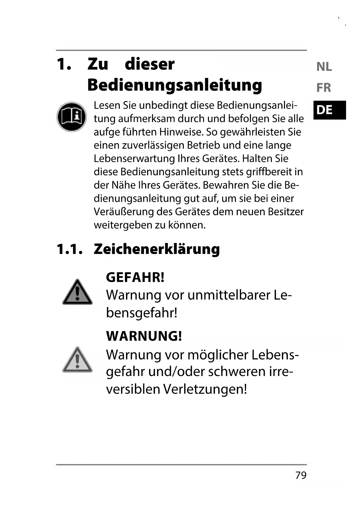 Bedienungsanleitung Lesen Sie unbedingt diese Bedienungsanlei- tung aufmerksam durch und befolgen Sie alle aufge führten Hinweise. So gewährleisten Sie einen zuverlässigen Betrieb und eine lange Lebenserwartung Ihres Gerätes. Halten Sie diese Bedienungsanleitung stets griffbereit in der Nähe Ihres Gerätes. Bewahren Sie die Be- dienungsanleitung gut auf, um sie bei einer Veräußerung des Gerätes dem neuen Besitzer weitergeben zu können. 1.1. Zeichenerklärung GEFAHR! Warnung vor unmittelbarer Le- bensgefahr! WARNUNG! Warnung vor möglicher Lebens- gefahr und/oder schweren irre- versiblen Verletzungen!