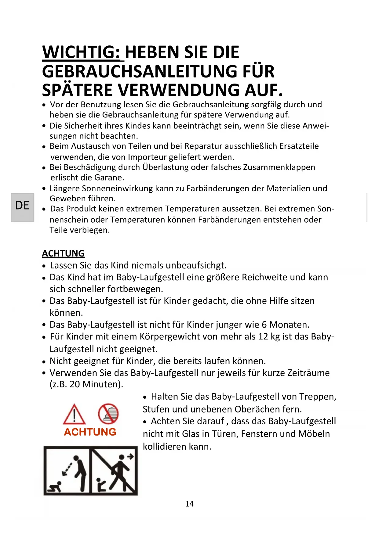 Bevor Sie ein Kind im Baby-Laufgestell setzen, vergewissern Sie sich bitte, dass das Baby-Laufgestell vollständig ausgefaltet ist und dass alle beweg- lichten Teile verriegelt sind. Um Verletzungen zu vermeiden, Ihr Kind fernhalten wenn Sie diese Produkt entfalten oder falten. Das Kind nicht mit diesem Produkt spielen lassen. Das Kind niemals im Baby-Laufgestell stehen lassen.