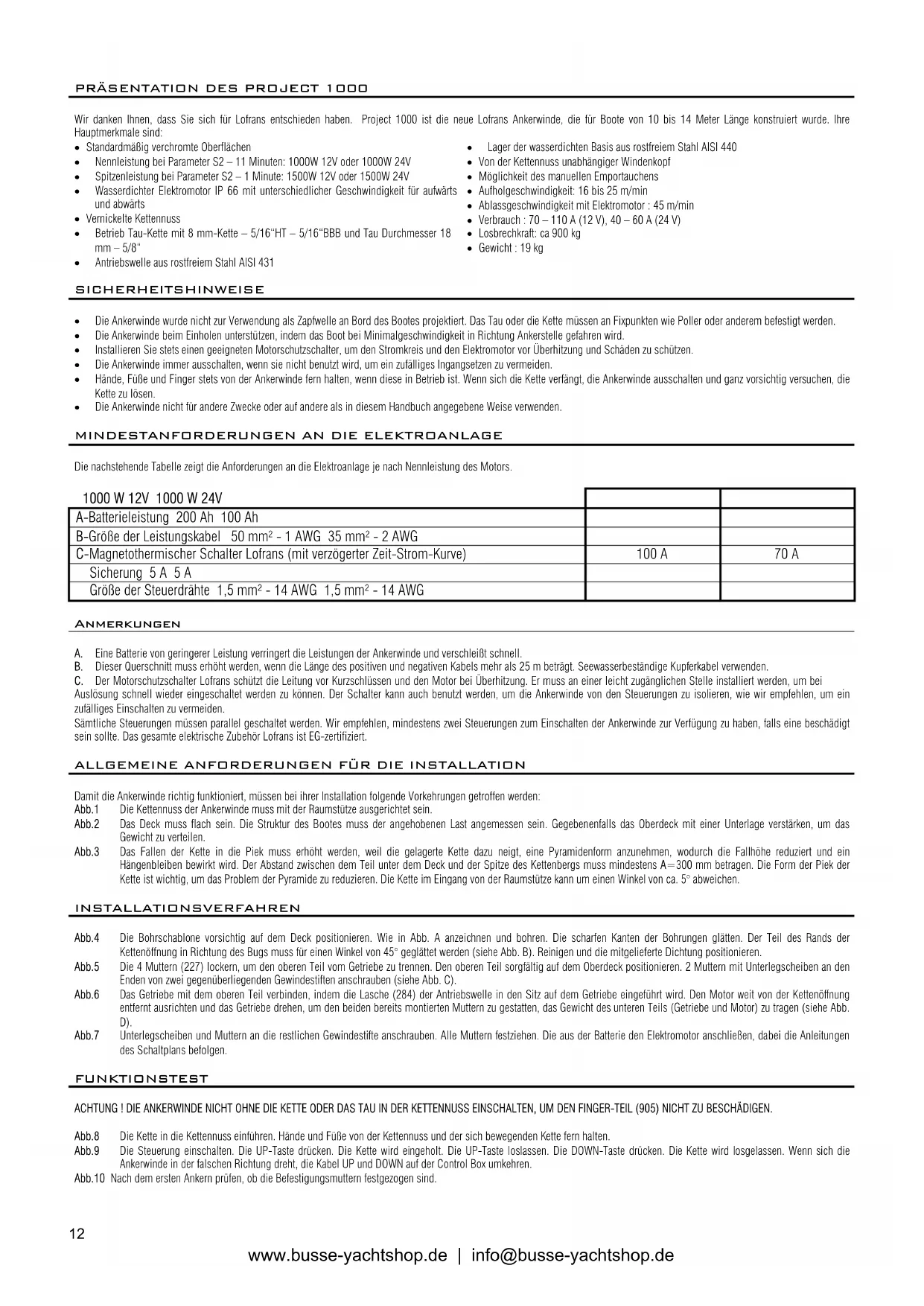 Präsentation des Project 1000 Pg.12 Ausbau des Führungsarms Pg.14 Sicherheitshinweise Pg.12 Garantiebedingungen Pg.14 Mindestanforderungen an die Elektroanlage Pg.12 Anhang Pg.14 Allgemeine Anforderungen für die Installation Pg.12 Elektr. Anschlußplan Pg.18 Installationsverfahren Pg.12 Bilder Pg.19 Funktionstest Pg.12 Explosionszeichnung Pg.20 Gebrauch der Ankerwinde Pg.13 Ersatzteilliste Pg.21 Wartungsplan Pg.13 Vertriebsstruktur Pg.22