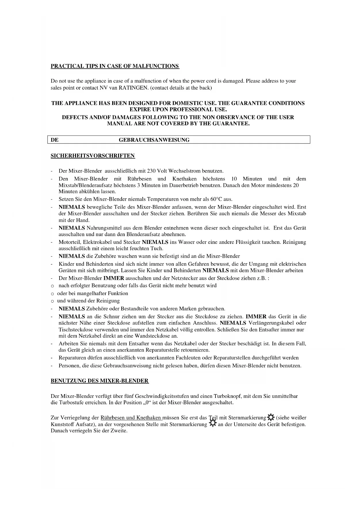 Bei einer Störung des Gerätes oder bei Beschädigung des Schnur, das Gerät nicht mehr gebrauchen. Wenden Sie sich dann direkt an Ihrem Verkaufspunkt oder kontaktieren Sie NV van RATINGEN. (Kontaktdaten hinten)