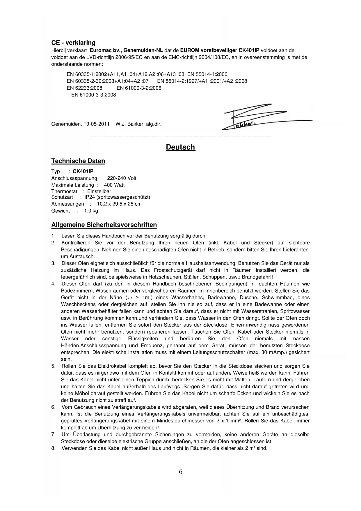 Hiermit erklärt Euromac BV., Genemuiden-NL, dass das EUROM Frostschutzgerät CK401IP den LVD-Richtlinien 2006/95/EC und den EMC-Richtlinien 2004/108/EC entspricht und mit den unten stehenden Normen konform geht: