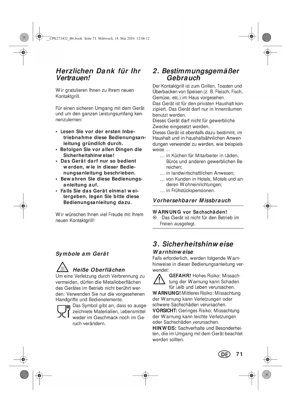 Gebrauch Der Kontaktgrill ist zum Grillen, Toasten und Überbacken von Speisen (z.|B. Fleisch, Fisch, Gemüse, etc.) im Haus vorgesehen. Das Gerät ist für den privaten Haushalt kon- zipiert. Das Gerät darf nur in Innenräumen benutzt werden. Dieses Gerät darf nicht für gewerbliche Zwecke eingesetzt werden. Dieses Gerät ist ebenfalls dazu bestimmt, im Haushalt und in haushaltsähnlichen Anwen- dungen verwendet zu werden, wie beispiels- weise ... … in Küchen für Mitarbeiter in Läden, Büros und anderen gewerblichen Be- reichen; … in landwirtschaftlichen Anwesen; … von Kunden in Hotels, Motels und an- deren Wohneinrichtungen; … in Frühstückspensionen. Vorhersehbarer Missbrauch WARNUNG vor Sachschäden! ~ Das Gerät ist nicht für den Betrieb im Freien ausgelegt.