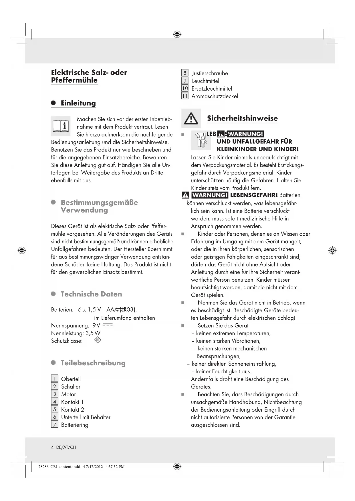 78286 CB1 content.indd 3 7/17/2012 4:57:32 PM4 DE/AT/CH Elektrische Salz- oder Pfeffermühle Einleitung Machen Sie sich vor der ersten Inbetrieb- nahme mit dem Produkt vertraut. Lesen Sie hierzu aufmerksam die nachfolgende Bedienungsanleitung und die Sicherheitshinweise. Benutzen Sie das Produkt nur wie beschrieben und für die angegebenen Einsatzbereiche. Bewahren Sie diese Anleitung gut auf. Händigen Sie alle Un- terlagen bei Weitergabe des Produkts an Dritte ebenfalls mit aus. Bestimmungsgemäße Verwendung Dieses Gerät ist als elektrische Salz- oder Pfeffer- mühle vorgesehen. Alle Veränderungen des Geräts sind nicht bestimmungsgemäß und können erhebliche Unfallgefahren bedeuten. Der Hersteller übernimmt für aus bestimmungswidriger Verwendung entstan- dene Schäden keine Haftung. Das Produkt ist nicht für den gewerblichen Einsatz bestimmt. Technische Daten Batterien: 6 x 1,5 V AAA (LR03), im Lieferumfang enthalten Nennspannung: 9 V Nennleistung: 3,5 W Schutzklasse: Teilebeschreibung