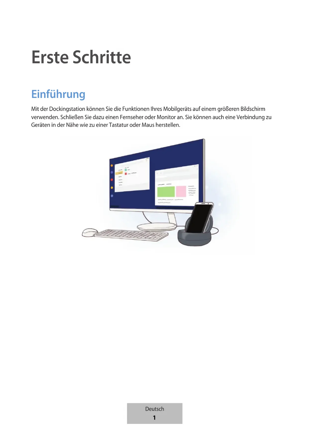 Erste Schritte Einführung Mit der Dockingstation können Sie die Funktionen Ihres Mobilgeräts auf einem größeren Bildschirm verwenden. Schließen Sie dazu einen Fernseher oder Monitor an. Sie können auch eine Verbindung zu Geräten in der Nähe wie zu einer Tastatur oder Maus herstellen. Deutsch 1Erste Schritte