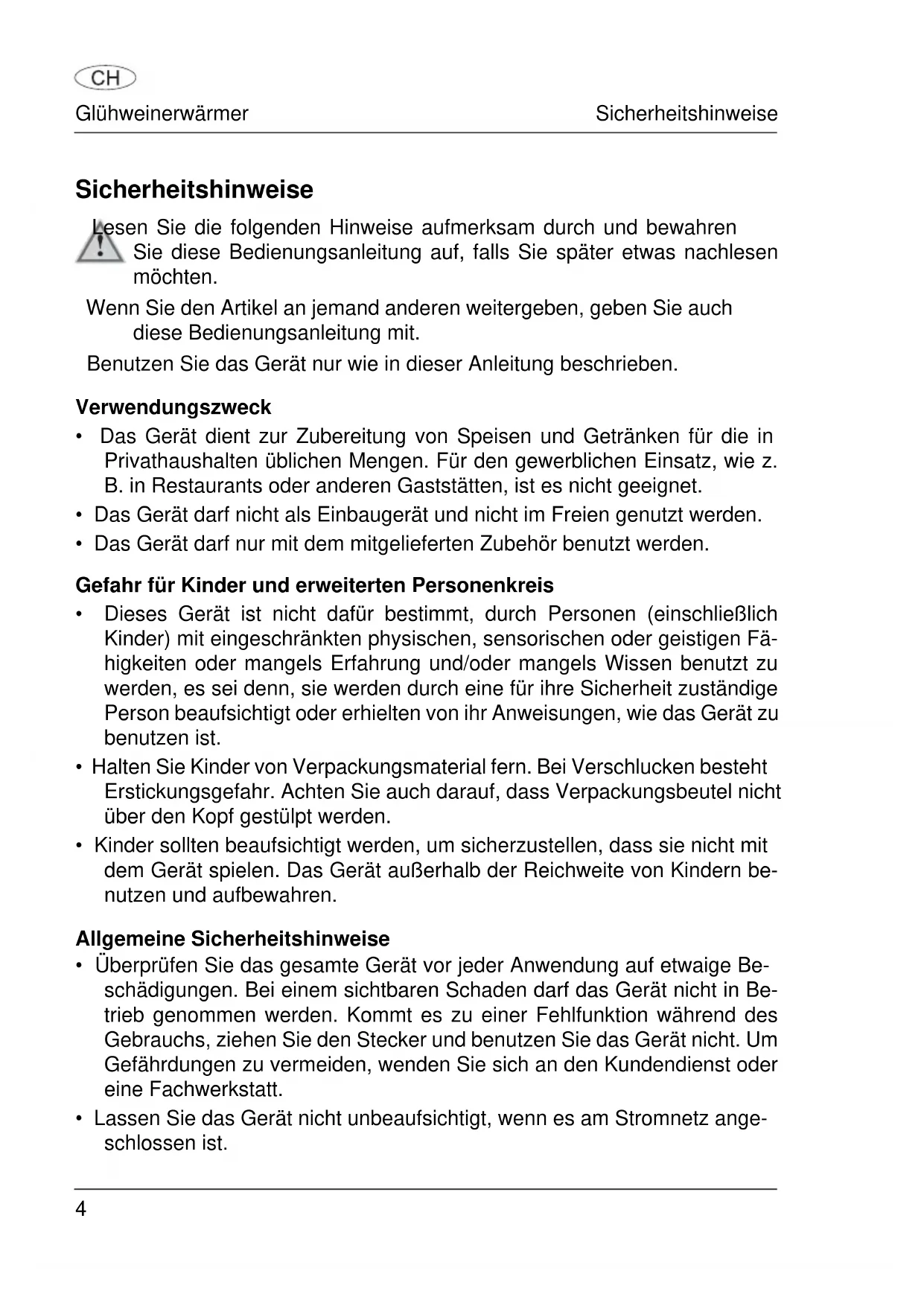 - Garantiekarte Sollte eines der hier aufgeführten Bauteile nicht im Lieferumfang enthalten sein, wenden Sie sich bitte an die Servicestelle! Glühweinerwärmer Inhaltsverzeichnis / Symbole / Lieferumfang4 Sicherheitshinweise Lesen Sie die folgenden Hinweise aufmerksam durch und bewahren Sie diese Bedienungsanleitung auf, falls Sie später etwas nachlesen möchten. Wenn Sie den Artikel an jemand anderen weitergeben, geben Sie auch diese Bedienungsanleitung mit. Benutzen Sie das Gerät nur wie in dieser Anleitung beschrieben. Verwendungszweck