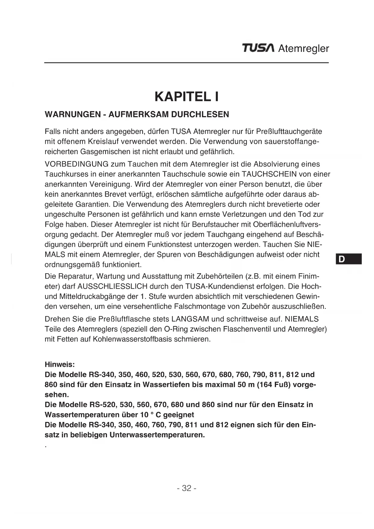Falls nicht anders angegeben, dürfen TUSA Atemregler nur für Preßlufttauchgeräte mit offenem Kreislauf verwendet werden. Die Verwendung von sauerstoffange- reicherten Gasgemischen ist nicht erlaubt und gefährlich. VORBEDINGUNG zum Tauchen mit dem Atemregler ist die Absolvierung eines Tauchkurses in einer anerkannten Tauchschule sowie ein TAUCHSCHEIN von einer anerkannten Vereinigung. Wird der Atemregler von einer Person benutzt, die über kein anerkanntes Brevet verfügt, erlöschen sämtliche aufgeführte oder daraus ab- geleitete Garantien. Die Verwendung des Atemreglers durch nicht brevetierte oder ungeschulte Personen ist gefährlich und kann ernste Verletzungen und den Tod zur Folge haben. Dieser Atemregler ist nicht für Berufstaucher mit Oberächenluftvers- orgung gedacht. Der Atemregler muß vor jedem Tauchgang eingehend auf Beschä- digungen überprüft und einem Funktionstest unterzogen werden. Tauchen Sie NIE- MALS mit einem Atemregler, der Spuren von Beschädigungen aufweist oder nicht ordnungsgemäß funktioniert. Die Reparatur, Wartung und Ausstattung mit Zubehörteilen (z.B. mit einem Finim- eter) darf AUSSCHLIESSLICH durch den TUSA-Kundendienst erfolgen. Die Hoch- und Mitteldruckabgänge der 1. Stufe wurden absichtlich mit verschiedenen Gewin- den versehen, um eine versehentliche Falschmontage von Zubehör auszuschließen. Drehen Sie die Preßluftflasche stets LANGSAM und schrittweise auf. NIEMALS Teile des Atemreglers (speziell den O-Ring zwischen Flaschenventil und Atemregler) mit Fetten auf Kohlenwasserstoffbasis schmieren. Hinweis: Die Modelle RS-340, 350, 460, 520, 530, 560, 670, 680, 760, 790, 811, 812 und 860 sind für den Einsatz in Wassertiefen bis maximal 50 m (164 Fuß) vorge- sehen. Die Modelle RS-520, 530, 560, 670, 680 und 860 sind nur für den Einsatz in Wassertemperaturen über 10 ° C geeignet Die Modelle RS-340, 350, 460, 760, 790, 811 und 812 eignen sich für den Ein- satz in beliebigen Unterwassertemperaturen. .- 33 - Atemregler KAPITEL II