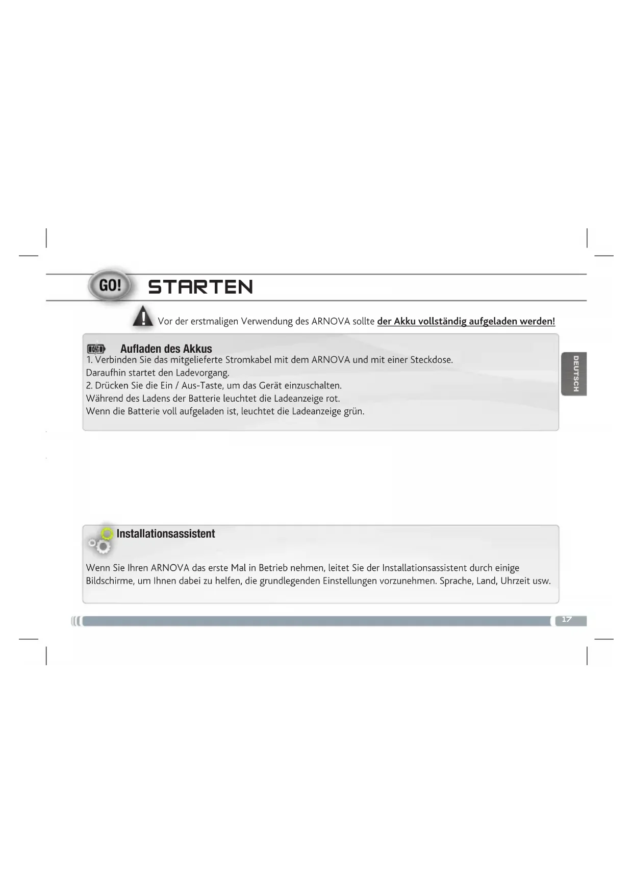 DEUTSCH Vor der erstmaligen Verwendung des ARNOVA sollte der Akku vollständig aufgeladen werden! STARTEN Auaden des Akkus Installationsassistent