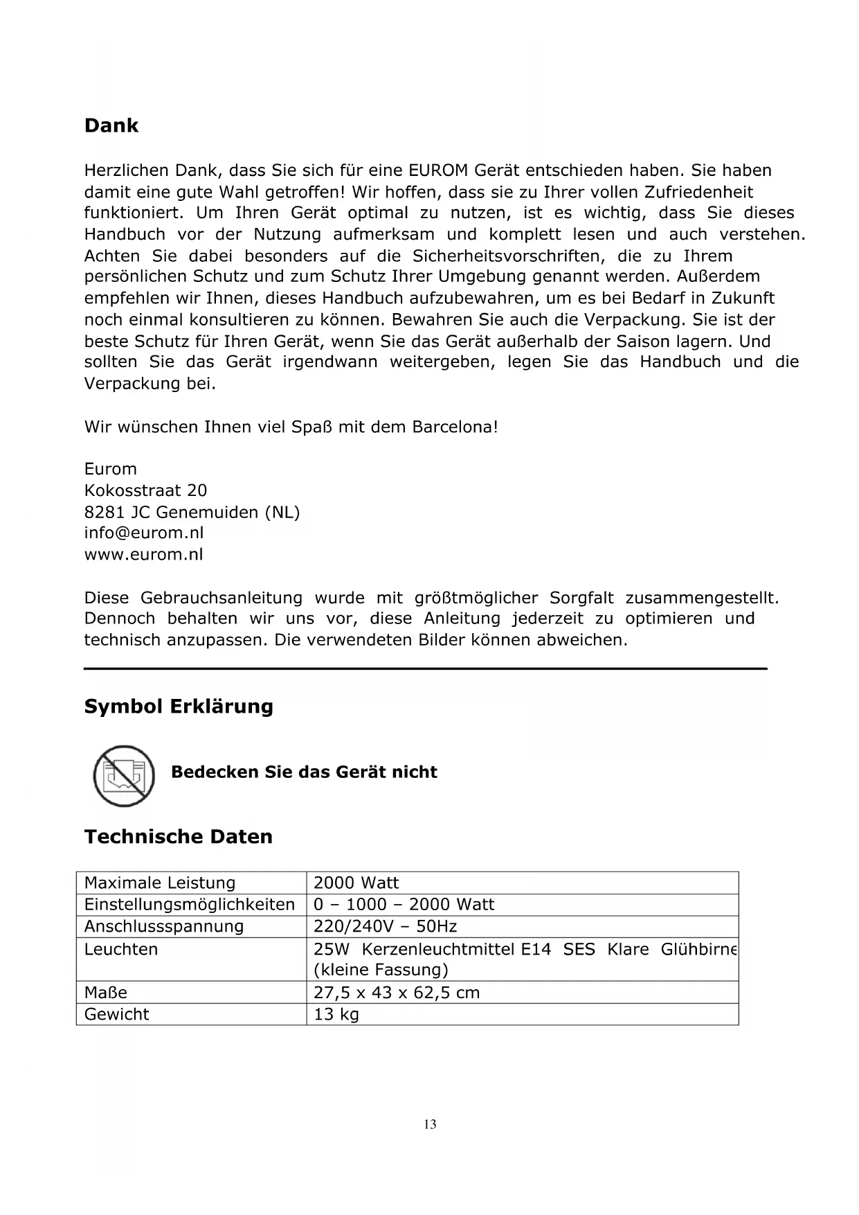 Dank Herzlichen Dank, dass Sie sich für eine EUROM Gerät entschieden haben. Sie haben damit eine gute Wahl getroffen! Wir hoffen, dass sie zu Ihrer vollen Zufriedenheit funktioniert. Um Ihren Gerät optimal zu nutzen, ist es wichtig, dass Sie dieses Handbuch vor der Nutzung aufmerksam und komplett lesen und auch verstehen. Achten Sie dabei besonders auf die Sicherheitsvorschriften, die zu Ihrem persönlichen Schutz und zum Schutz Ihrer Umgebung genannt werden. Außerdem empfehlen wir Ihnen, dieses Handbuch aufzubewahren, um es bei Bedarf in Zukunft noch einmal konsultieren zu können. Bewahren Sie auch die Verpackung. Sie ist der beste Schutz für Ihren Gerät, wenn Sie das Gerät außerhalb der Saison lagern. Und sollten Sie das Gerät irgendwann weitergeben, legen Sie das Handbuch und die Verpackung bei. Wir wünschen Ihnen viel Spaß mit dem Barcelona! Eurom Kokosstraat 20 8281 JC Genemuiden (NL) info@eurom.nl www.eurom.nl Diese Gebrauchsanleitung wurde mit größtmöglicher Sorgfalt zusammengestellt. Dennoch behalten wir uns vor, diese Anleitung jederzeit zu optimieren und technisch anzupassen. Die verwendeten Bilder können abweichen.