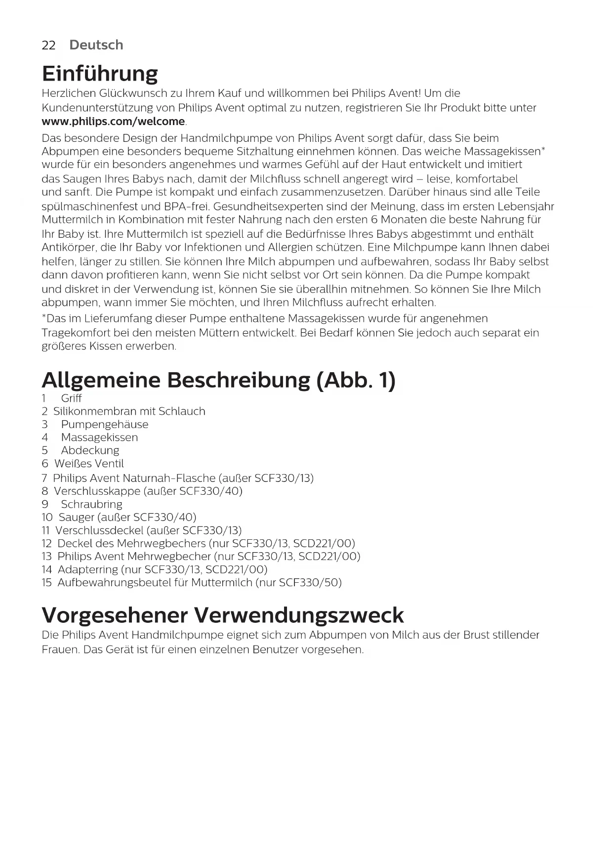 DanskEinführung Herzlichen Glückwunsch zu Ihrem Kauf und willkommen bei Philips Avent! Um die Kundenunterstützung von Philips Avent optimal zu nutzen, registrieren Sie Ihr Produkt bitte unter www.philips.com/welcome. Das besondere Design der Handmilchpumpe von Philips Avent sorgt dafür, dass Sie beim Abpumpen eine besonders bequeme Sitzhaltung einnehmen können. Das weiche Massagekissen* wurde für ein besonders angenehmes und warmes Gefühl auf der Haut entwickelt und imitiert das Saugen Ihres Babys nach, damit der Milchuss schnell angeregt wird – leise, komfortabel und sanft. Die Pumpe ist kompakt und einfach zusammenzusetzen. Darüber hinaus sind alle Teile spülmaschinenfest und BPA-frei. Gesundheitsexperten sind der Meinung, dass im ersten Lebensjahr Muttermilch in Kombination mit fester Nahrung nach den ersten 6 Monaten die beste Nahrung für Ihr Baby ist. Ihre Muttermilch ist speziell auf die Bedürfnisse Ihres Babys abgestimmt und enthält Antikörper, die Ihr Baby vor Infektionen und Allergien schützen. Eine Milchpumpe kann Ihnen dabei helfen, länger zu stillen. Sie können Ihre Milch abpumpen und aufbewahren, sodass Ihr Baby selbst dann davon protieren kann, wenn Sie nicht selbst vor Ort sein können. Da die Pumpe kompakt und diskret in der Verwendung ist, können Sie sie überallhin mitnehmen. So können Sie Ihre Milch abpumpen, wann immer Sie möchten, und Ihren Milchuss aufrecht erhalten. *Das im Lieferumfang dieser Pumpe enthaltene Massagekissen wurde für angenehmen Tragekomfort bei den meisten Müttern entwickelt. Bei Bedarf können Sie jedoch auch separat ein größeres Kissen erwerben. Allgemeine Beschreibung (Abb. 1) 1 Gri 2 Silikonmembran mit Schlauch 3 Pumpengehäuse 4 Massagekissen 5 Abdeckung 6 Weißes Ventil 7 Philips Avent Naturnah-Flasche (außer SCF330/13) 8 Verschlusskappe (außer SCF330/40) 9 Schraubring 10 Sauger (außer SCF330/40) 11 Verschlussdeckel (außer SCF330/13) 12 Deckel des Mehrwegbechers (nur SCF330/13, SCD221/00) 13 Philips Avent Mehrwegbecher (nur SCF330/13, SCD221/00) 14 Adapterring (nur SCF330/13, SCD221/00) 15 Aufbewahrungsbeutel für Muttermilch (nur SCF330/50) Vorgesehener Verwendungszweck Die Philips Avent Handmilchpumpe eignet sich zum Abpumpen von Milch aus der Brust stillender Frauen. Das Gerät ist für einen einzelnen Benutzer vorgesehen.