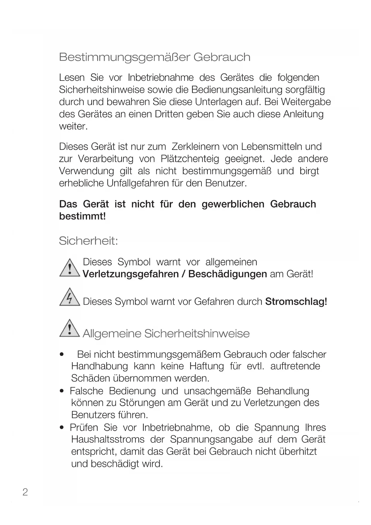 Bestimmungsgemäßer Gebrauch Lesen Sie vor Inbetriebnahme des Gerätes die folgenden Sicherheitshinweise sowie die Bedienungsanleitung sorgfältig durch und bewahren Sie diese Unterlagen auf. Bei Weitergabe des Gerätes an einen Dritten geben Sie auch diese Anleitung weiter. Dieses Gerät ist nur zum Zerkleinern von Lebensmitteln und zur Verarbeitung von Plätzchenteig geeignet. Jede andere Verwendung gilt als nicht bestimmungsgemäß und birgt erhebliche Unfallgefahren für den Benutzer. Das Gerät ist nicht für den gewerblichen Gebrauch bestimmt! Sicherheit: Dieses Symbol warnt vor allgemeinen Verletzungsgefahren / Beschädigungen am Gerät! Dieses Symbol warnt vor Gefahren durch Stromschlag! Allgemeine Sicherheitshinweise