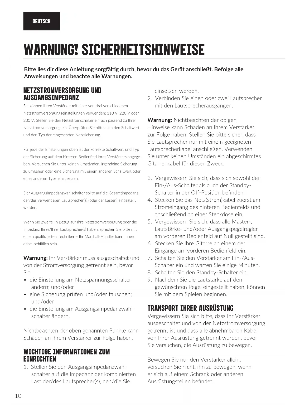 Vergewissern Sie sich bie, dass Ihr Verstärker ausgeschaltet und von der Netzstromversorgung getrennt ist und dass alle abnehmbaren Kabel von Ihrer Ausrüstung getrennt wurden, bevor Sie versuchen, die Ausrüstung zu bewegen. Bewegen Sie nur den Verstärker allein, versuchen Sie nicht, ihn zu bewegen, wenn er sich auf einem Schrank oder anderen Ausrüstungsteilen bendet. NETZSTROMVERSORGUNG UND AUSGANGSIMPEDANZ Sie können Ihren Verstärker mit einer von drei verschiedenen Netzstromversorgungseinstellungen verwenden: 110 V, 220 V oder 230 V. Stellen Sie den Netzstromschalter einfach passend zu Ihrer Netzstromversorgung ein. Überprüfen Sie bie auch den Schaltwert und den Typ der eingesetzten Netzsicherung. Für jede der Einstellungen oben ist der korrekte Schaltwert und Typ der Sicherung auf dem hinteren Bedienfeld Ihres Verstärkers angege-ben. Versuchen Sie unter keinen Umständen, irgendeine Sicherung zu umgehen oder eine Sicherung mit einem anderen Schaltwert oder eines anderen Typs einzusetzen.Der Ausgangsimpedanzwahlschalter sollte auf die Gesammpedanz der/des verwendeten Lautsprecher(s) (oder der Lasten) eingestellt werden.Wenn Sie Zweifel in Bezug auf Ihre Netzstromversorgung oder die Impedanz Ihres/Ihrer Lautsprecher(s) haben, sprechen Sie bie mit einem qualizierten Techniker – Ihr Marshall-Händler kann Ihnen dabei behilich sein. Warnung: Ihr Verstärker muss ausgeschaltet und von der Stromversorgung getrennt sein, bevor Sie: