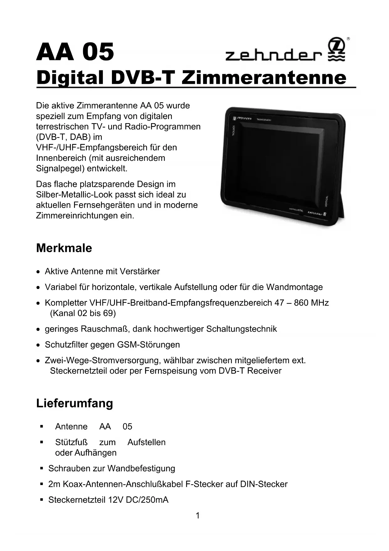 AA 05 - TV-Antenne ZEHNDER - Kostenlose Bedienungsanleitung