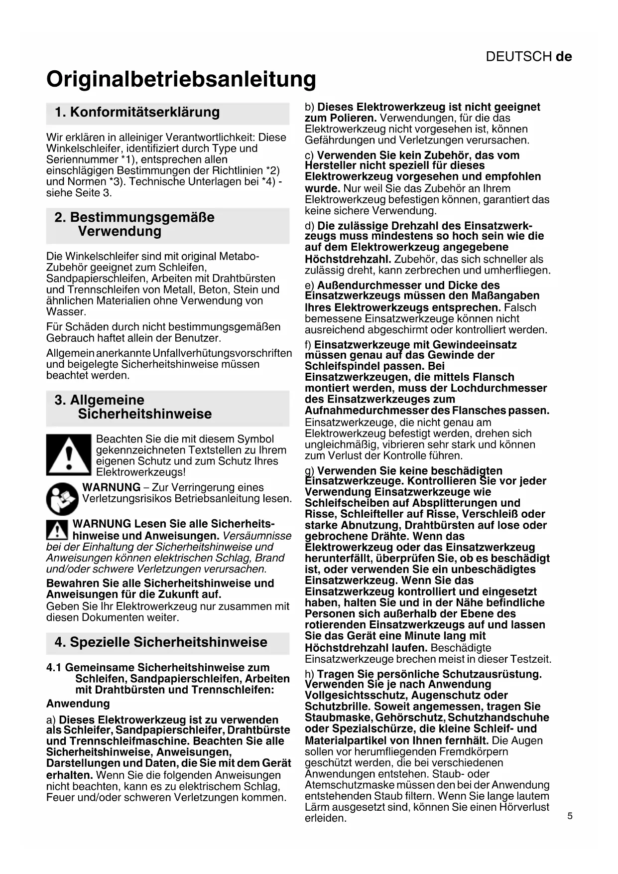 Originalbetriebsanleitung Wir erklären in alleiniger Verantwortlichkeit: Diese Winkelschleifer, identifiziert durch Type und Seriennummer *1), entsprechen allen einschlägigen Bestimmungen der Richtlinien *2) und Normen *3). Technische Unterlagen bei *4) - siehe Seite 3. Die Winkelschleifer sind mit original Metabo- Zubehör geeignet zum Schleifen, Sandpapierschleifen, Arbeiten mit Drahtbürsten und Trennschleifen von Metall, Beton, Stein und ähnlichen Materialien ohne Verwendung von Wasser. Für Schäden durch nicht bestimmungsgemäßen Gebrauch haftet allein der Benutzer. Allgemein anerkannte Unfallverhütungsvorschriften und beigelegte Sicherheitshinweise müssen beachtet werden. Beachten Sie die mit diesem Symbol gekennzeichneten Textstellen zu Ihrem eigenen Schutz und zum Schutz Ihres Elektrowerkzeugs! WARNUNG – Zur Verringerung eines Verletzungsrisikos Betriebsanleitung lesen. WARNUNG Lesen Sie alle Sicherheits- hinweise und Anweisungen. Versäumnisse bei der Einhaltung der Sicherheitshinweise und Anweisungen können elektrischen Schlag, Brand und/oder schwere Verletzungen verursachen. Bewahren Sie alle Sicherheitshinweise und Anweisungen für die Zukunft auf. Geben Sie Ihr Elektrowerkzeug nur zusammen mit diesen Dokumenten weiter.