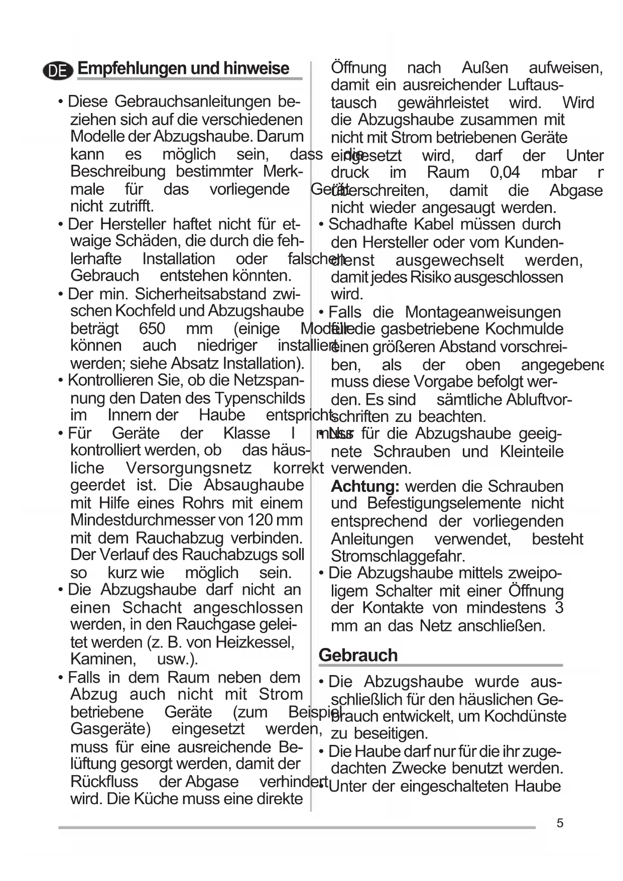- Falls in dem Raum neben dem Abzug auch nicht mit Strom betriebene Geräte (zum Beispiel Gasgeräte) eingesetzt werden, muss für eine ausreichende Be- lüftunggesorgtwerden,damitder Rückuss derAbgase verhindert wird. Die Küche muss eine direkte Öffnung nach Außen aufweisen, damit ein ausreichender Luftaus- tausch gewährleistet wird. Wird die Abzugshaube zusammen mit nichtmitStrombetriebenenGeräte eingesetzt wird, darf der Unter- druck im Raum 0,04 mbar nicht überschreiten, damit die Abgase nicht wieder angesaugt werden.