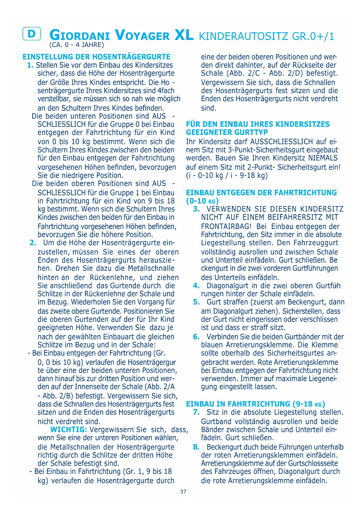 - LESEN SIE DIESE ANLEITUNG SORGFÄLTIG, BEVOR SIE MIT DEM EINBAU BEGINNEN. EIN UNKORREKTER EINBAU KANN GEFÄHRLICH SEIN. VERWENDEN SIE DIESEN KINDERSITZ NICT AUF EINEM BEIFAHRERSITZ MIT FRONTAIRBAG!