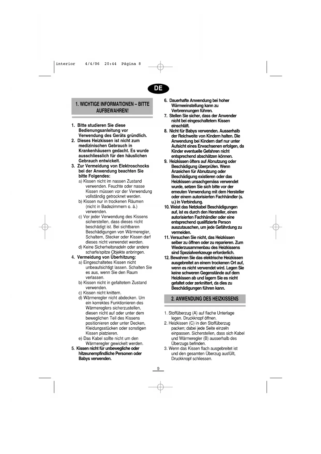 bei der Anwendung beachten Sie bitte Folgendes: a) Kissen nicht im nassen Zustand verwenden. Feuchte oder nasse Kissen müssen vor der Verwendung vollständig getrocknet werden. b) Kissen nur in trockenen Räumen (nicht in Badezimmern o. ä.) verwenden. c) Vor jeder Verwendung des Kissens sicherstellen, dass dieses nicht beschädigt ist. Bei sichtbaren Beschädigungen von Wärmeregler, Schaltern, Stecker oder Kissen darf dieses nicht verwendet werden. d) Keine Sicherheitsnadeln oder andere scharfe/spitze Objekte anbringen.