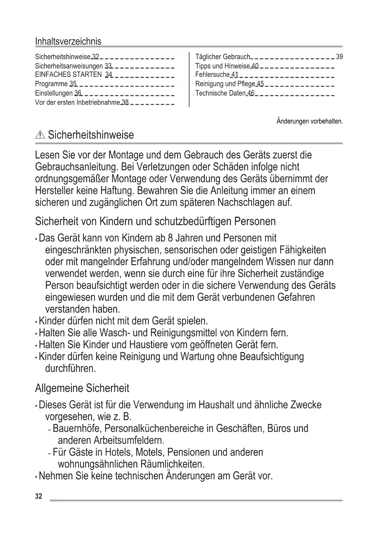 Tipps und Hinweise 40 Fehlersuche 41 Reinigung und Pflege 45 Technische Daten 46 Änderungen vorbehalten. Sicherheitshinweise Lesen Sie vor der Montage und dem Gebrauch des Geräts zuerst die Gebrauchsanleitung. Bei Verletzungen oder Schäden infolge nicht ordnungsgemäßer Montage oder Verwendung des Geräts übernimmt der Hersteller keine Haftung. Bewahren Sie die Anleitung immer an einem sicheren und zugänglichen Ort zum späteren Nachschlagen auf. Sicherheit von Kindern und schutzbedürftigen Personen