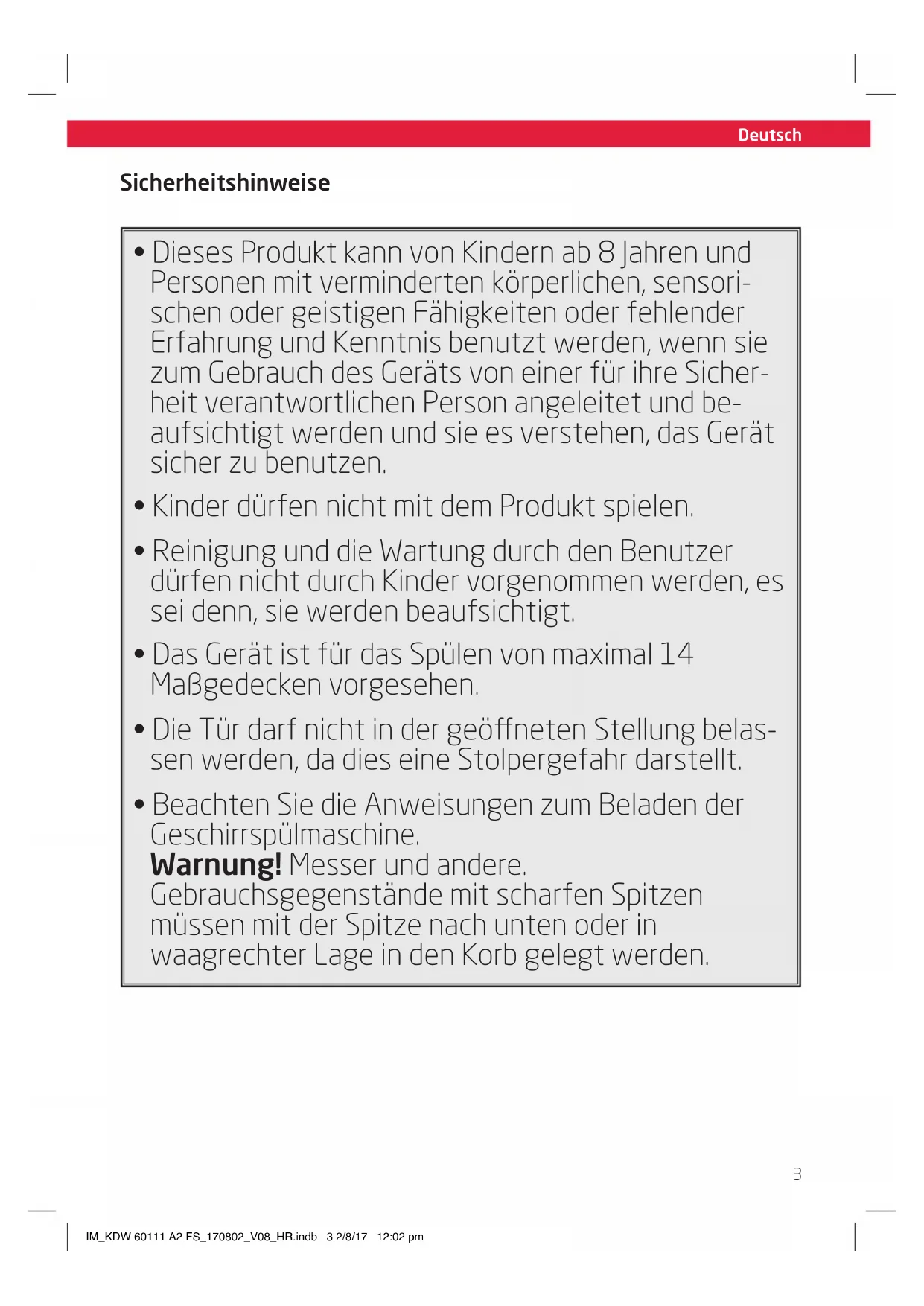 - Beachten Sie die Anweisungen zum Beladen der Geschirrspülmaschine. Warnung! Messer und andere. Gebrauchsgegenstände mit scharfen Spitzen müssen mit der Spitze nach unten oder in waagrechter Lage in den Korb gelegt werden. IM_KDW 60111 A2 FS_170802_V08_HR.indb 3 2/8/17 12:02 pmDeutsch