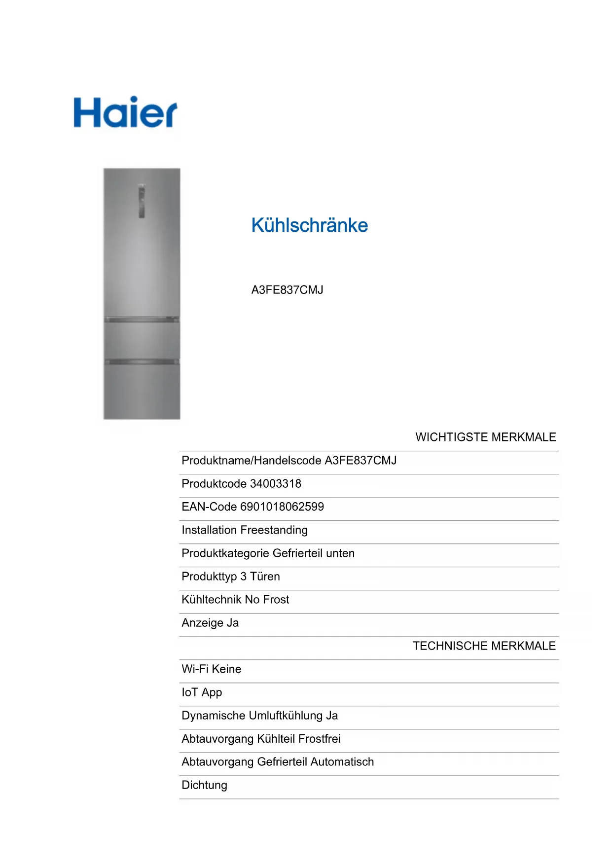 A3FE837CMJ - Kühlschrank HAIER - Kostenlose Bedienungsanleitung