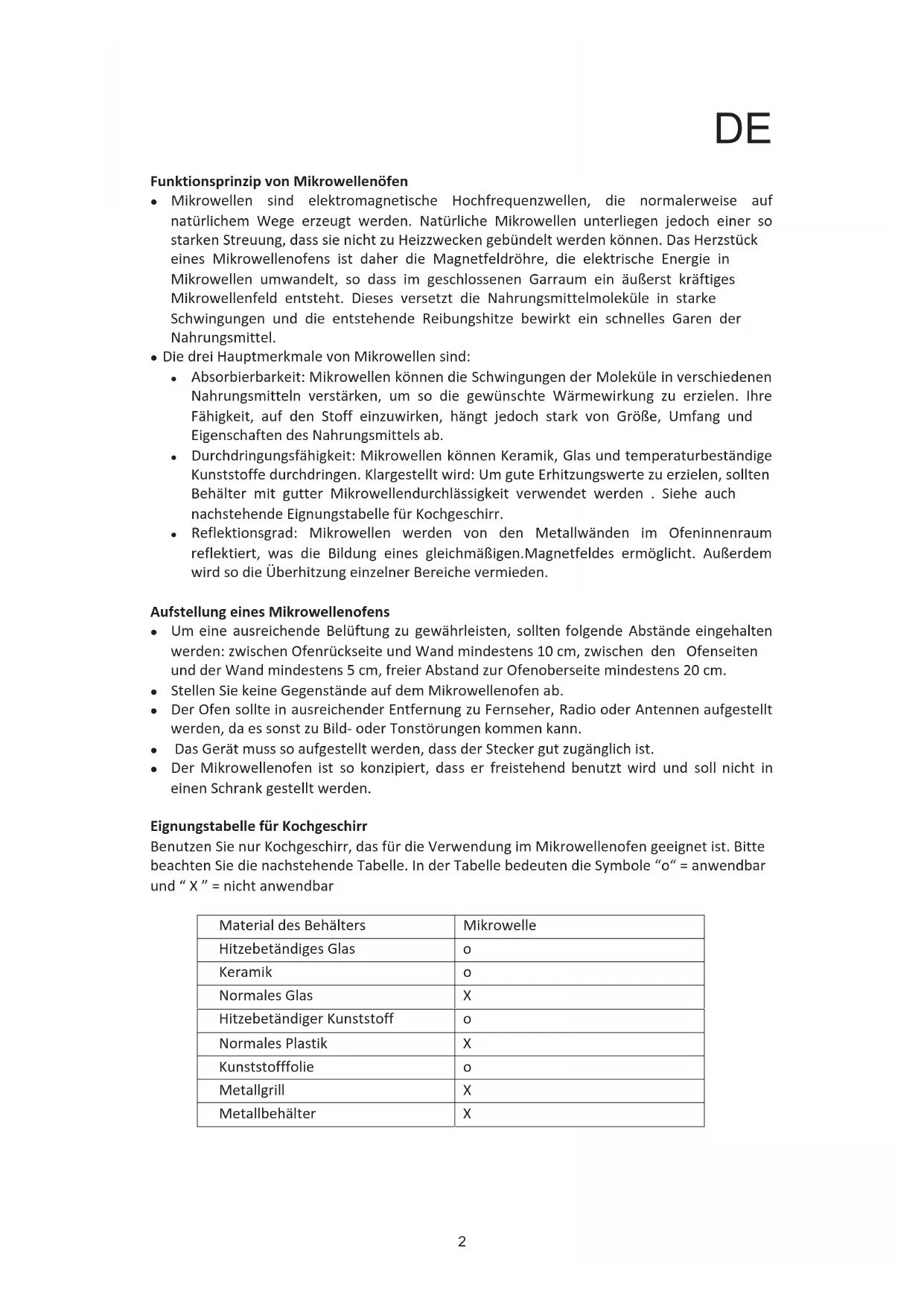 EignungstabellefürKochgeschirr BenutzenSienurKochgeschirr,dasfürdieVerwendungimMikrowellenofengeeignetist.Bitte beachtenSiedienachstehendeTabelle.InderTabellebedeutendieSymbole“o“=anwendbar und“X”=nichtanwendbar