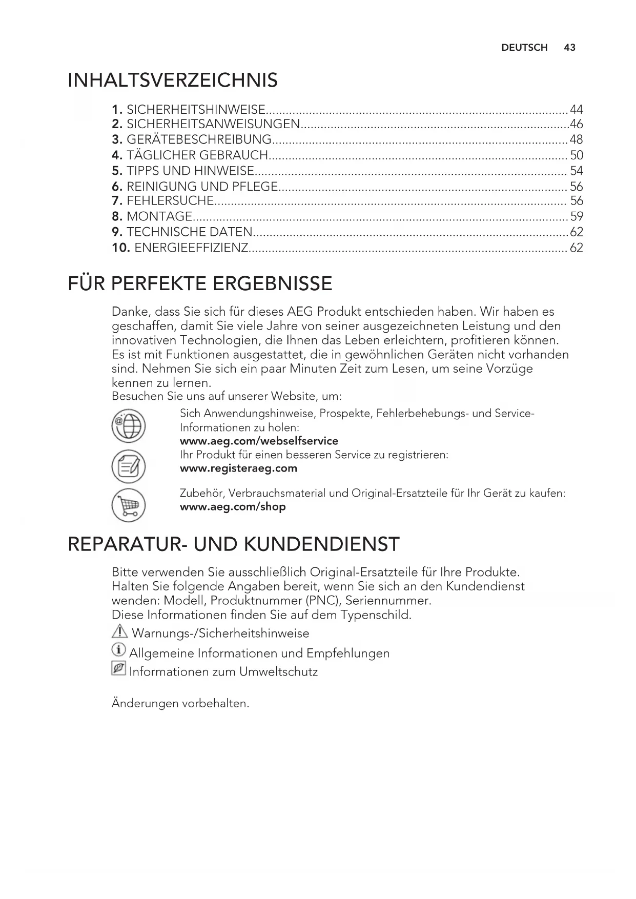 Danke, dass Sie sich für dieses AEG Produkt entschieden haben. Wir haben es geschaffen, damit Sie viele Jahre von seiner ausgezeichneten Leistung und den innovativen Technologien, die Ihnen das Leben erleichtern, profitieren können. Es ist mit Funktionen ausgestattet, die in gewöhnlichen Geräten nicht vorhanden sind. Nehmen Sie sich ein paar Minuten Zeit zum Lesen, um seine Vorzüge kennen zu lernen. Besuchen Sie uns auf unserer Website, um: Sich Anwendungshinweise, Prospekte, Fehlerbehebungs- und Service- Informationen zu holen: www.aeg.com/webselfservice Ihr Produkt für einen besseren Service zu registrieren: www.registeraeg.com Zubehör, Verbrauchsmaterial und Original-Ersatzteile für Ihr Gerät zu kaufen: www.aeg.com/shop
