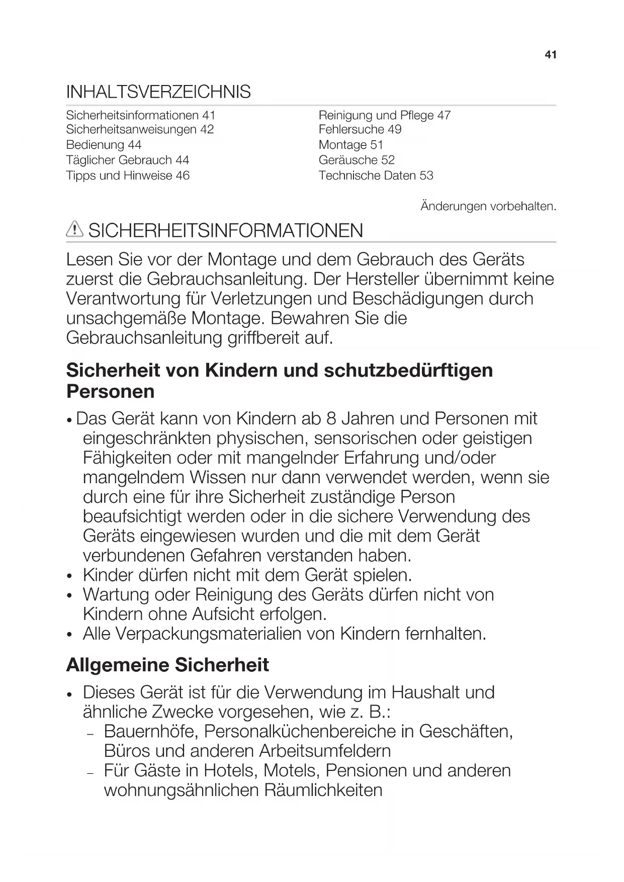CLICK! CLICK! SSSRRR! SSSRRR! 52BRRR! BRRR! HISSS! HISSS! BLUBB! BLUBB! CRACK!CRACK! TECHNISCHE DATEN Technische Daten Abmessungen der Einbaunische Höhe mm 1030 Breite mm 560 Tiefe mm 550 Lagerzeit bei Störung Stunden 12 Spannung Volt 230 - 240 Frequenz Hz 50 Die technischen Daten befinden sich auf dem Typenschild auf der Außen- oder Innenseite des Geräts sowie auf der Energieplakette. 53UMWELTTIPPS Recyceln Sie Materialien mit dem Symbol . Entsorgen Sie die Verpackung in den entsprechenden Recyclingbehältern. Recyceln Sie zum Umwelt- und Gesundheitsschutz elektrische und elektronische Geräte. Entsorgen Sie Geräte mit diesem Symbol nicht mit dem Hausmüll. Bringen Sie das Gerät zu Ihrer örtlichen Sammelstelle oder wenden Sie sich an Ihr Gemeindeamt.