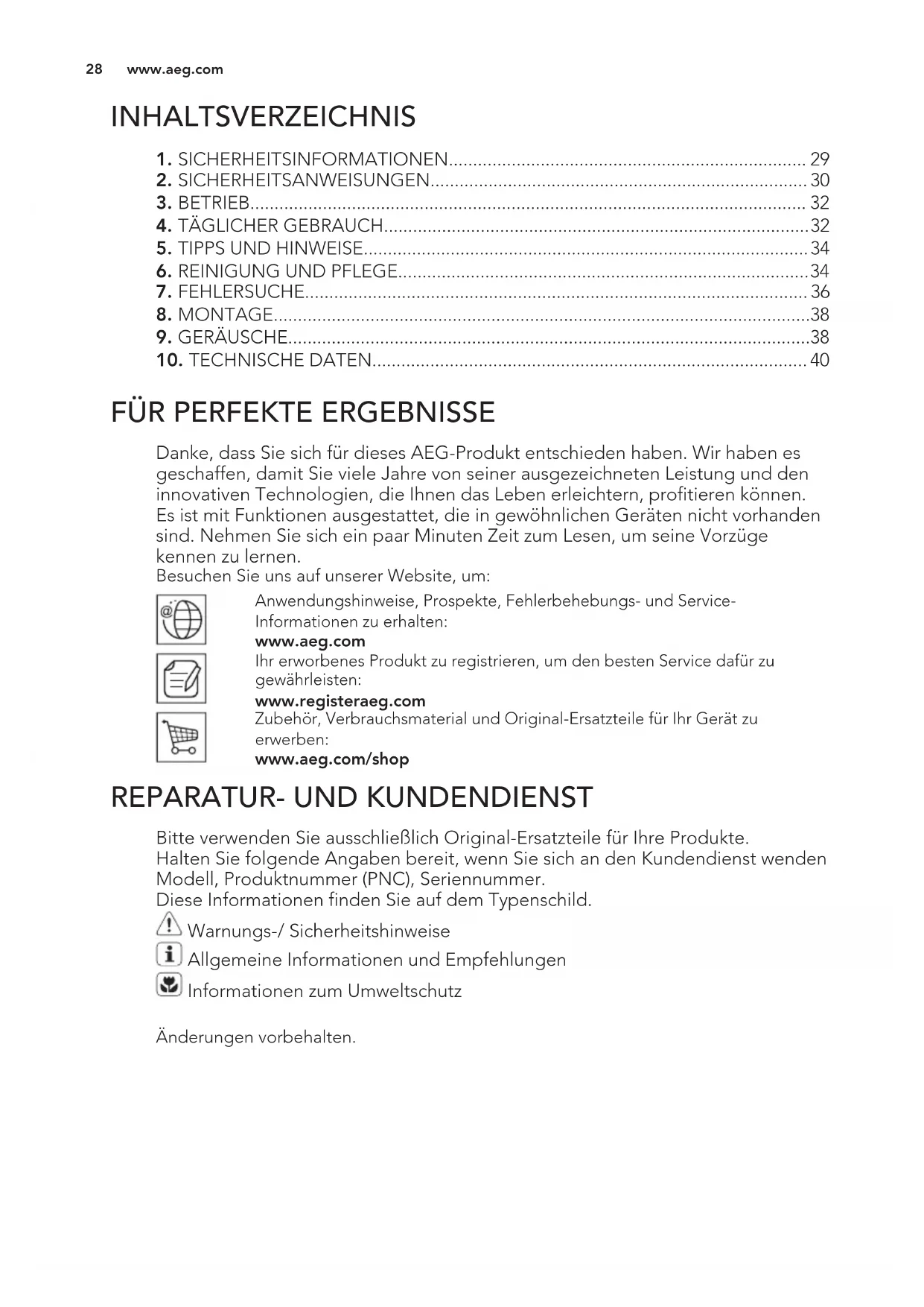 Bitte verwenden Sie ausschließlich Original-Ersatzteile für Ihre Produkte. Halten Sie folgende Angaben bereit, wenn Sie sich an den Kundendienst wenden Modell, Produktnummer (PNC), Seriennummer. Diese Informationen finden Sie auf dem Typenschild. Warnungs-/ Sicherheitshinweise Allgemeine Informationen und Empfehlungen Informationen zum Umweltschutz Änderungen vorbehalten. www.aeg.com
