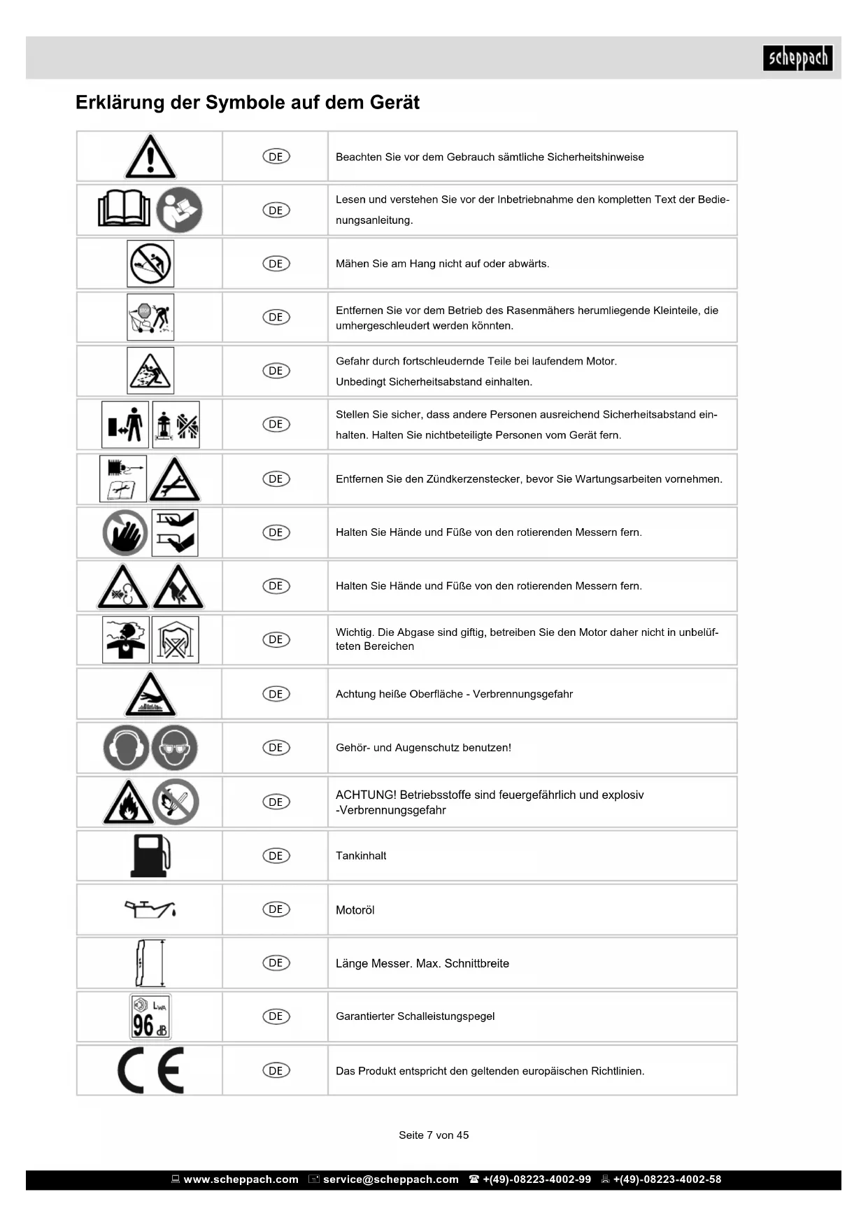 - Der Benzin Rasenmäher ist für die private Be- nutzung im Haus- und Hobbygarten geeignet. Als Rasenmäher für den privaten Haus- und Hobbygarten werden solche angesehen, deren jährliche Benutzung in der Regel 50 Stunden nicht übersteigen und die vorwiegend für die Pege von Gras oder Rasenächen verwendet werden, nicht jedoch in öffentlichen Anlagen, Parks, Sportstät- ten sowie nicht in der Land- und Forstwirtschaft. Achtung! Wegen körperlicher Gefährdung des Benutzers darf der Rasenmäher nicht zu folgenden Arbeiten eingesetzt werden: zum Trimmen von Büschen, Hecken und Sträuchern, zum Schneiden und Zerkleinern von Rankgewächsen oder Rasen auf Dachbepanzungen oder in Balkonkästen und zum Reinigen (Absaugen) von Gehwegen und als Häcksler zum Zerkleinern von Baum- und Hecken- abschnitten. Ferner darf der Rasenmäher nicht als Motorhacke verwendet werden zum Einebnen von Bodenerhebungen, wie z.B. Maulwurfshügel.Seite 11 von 45 www.scheppach.com service@scheppach.com +(49)-08223-4002-99 +(49)-08223-4002-58 www.scheppach.com service@scheppach.com +(49)-08223-4002-99 +(49)-08223-4002-58 licher Beleuchtung. Wenn möglich, ist der Einsatz des Gerätes bei nassem Gras zu vermeiden.