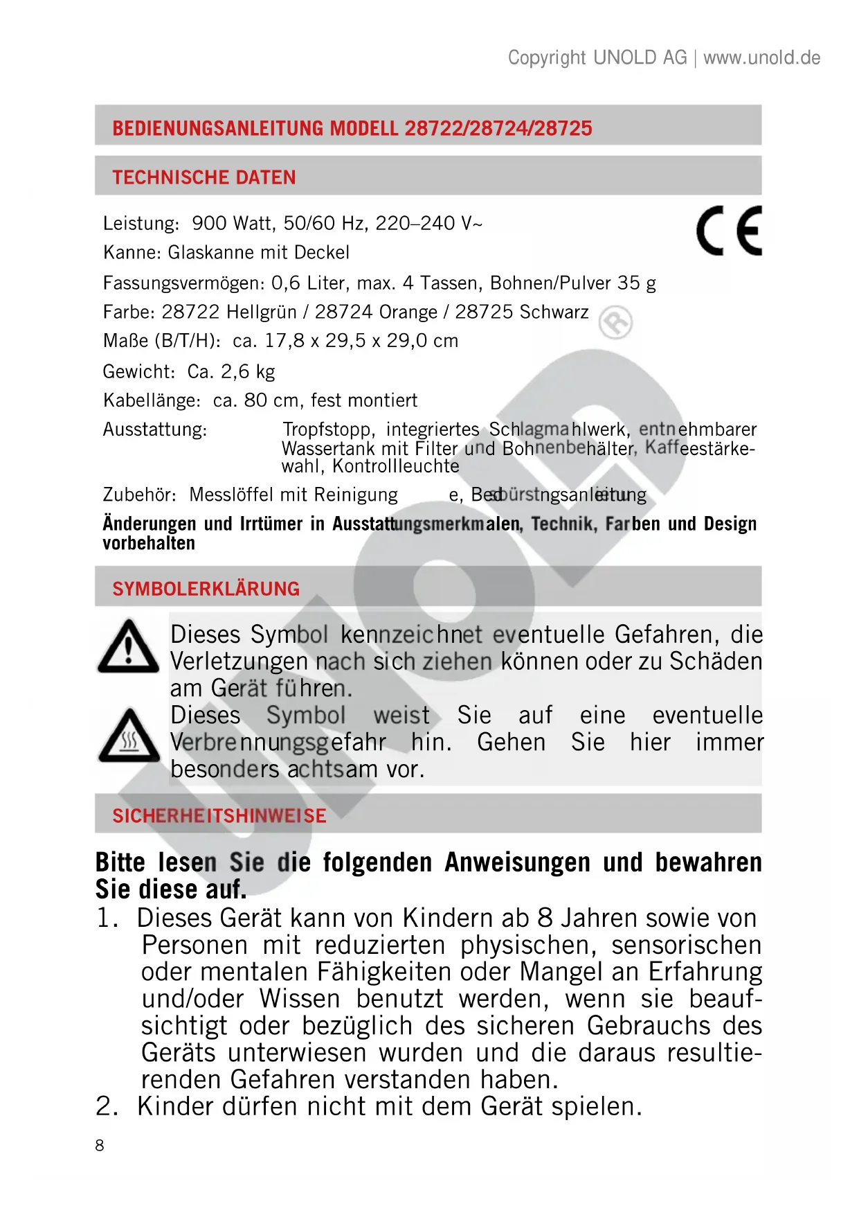 SYMBOLERKLÄRUNG Dieses Symbol kennzeichnet eventuelle Gefahren, die Verletzungen nach sich ziehen können oder zu Schäden am Gerät führen. Dieses Symbol weist Sie auf eine eventuelle Verbrennungsgefahr hin. Gehen Sie hier immer besonders achtsam vor. Leistung: 900 Watt, 50/60 Hz, 220–240 V~ Kanne: Glaskanne mit Deckel Fassungsvermögen: 0,6 Liter, max. 4 Tassen, Bohnen/Pulver 35 g Farbe: 28722 Hellgrün / 28724 Orange / 28725 Schwarz Maße (B/T/H): ca. 17,8 x 29,5 x 29,0 cm Gewicht: Ca. 2,6 kg Kabellänge: ca. 80 cm, fest montiert Ausstattung: Tropfstopp, integriertes Schlagmahlwerk, entnehmbarer Wassertank mit Filter und Bohnenbehälter, Kaffeestärke- wahl, Kontrollleuchte Zubehör: Messlöffel mit Reinigungsbürste, Bedienungsanleitung Änderungen und Irrtümer in Ausstattungsmerkmalen, Technik, Farben und Design vorbehalten Copyright UNOLD AG | www.unold.de9