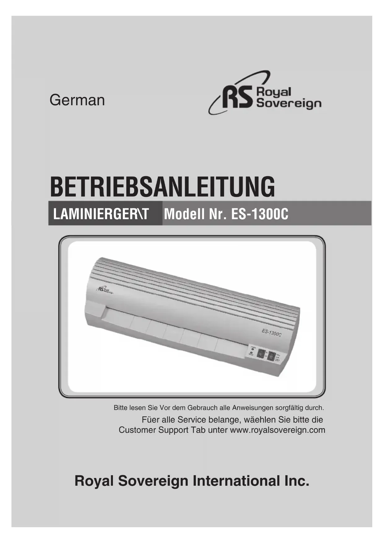 E-mail : info@royalsovereign.comLAMINIERGER\T Modell Nr. ES-1300C BETRIEBSANLEITUNG Royal Sovereign International Inc. German Bitte lesen Sie Vor dem Gebrauch alle Anweisungen sorgfältig durch. Füer alle Service belange, wäehlen Sie bitte die Customer Support Tab unter www.royalsovereign.comHAUPTKOMPONENTEN 30