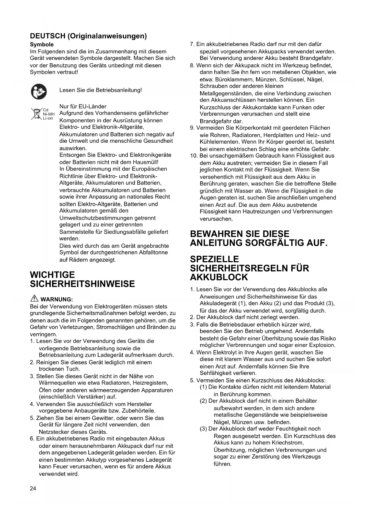 (1) Die Kontakte dürfen nicht mit leitendem Material in Berührung kommen. (2) Der Akkublock darf nicht in einem Behälter aufbewahrt werden, in dem sich andere metallische Gegenstände wie beispielsweise Nägel, Münzen usw. befinden. (3) Der Akkublock darf weder Feuchtigkeit noch Regen ausgesetzt werden. Ein Kurzschluss des Akkus kann zu hohem Kriechstrom, Überhitzung, möglichen Verbrennungen und sogar zu einer Zerstörung des Werkzeugs führen. Lesen Sie die Betriebsanleitung! Nur für EU-Länder Aufgrund des Vorhandenseins gefährlicher Komponenten in der Ausrüstung können Elektro- und Elektronik-Altgeräte, Akkumulatoren und Batterien sich negativ auf die Umwelt und die menschliche Gesundheit auswirken. Entsorgen Sie Elektro- und Elektronikgeräte oder Batterien nicht mit dem Hausmüll! In Übereinstimmung mit der Europäischen Richtlinie über Elektro- und Elektronik- Altgeräte, Akkumulatoren und Batterien, verbrauchte Akkumulatoren und Batterien sowie ihrer Anpassung an nationales Recht sollten Elektro-Altgeräte, Batterien und Akkumulatoren gemäß den Umweltschutzbestimmungen getrennt gelagert und zu einer getrennten Sammelstelle für Siedlungsabfälle geliefert werden. Dies wird durch das am Gerät angebrachte Symbol der durchgestrichenen Abfalltonne auf Rädern angezeigt.