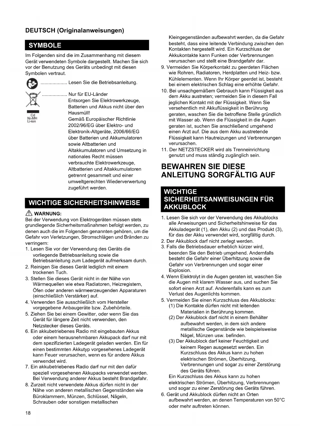 - N’utilisez jamais d’essence, de benzine, de diluant, d’alcool ou de produit similaire. Ces produits risquent de provoquer des décolorations, des déformations ou des fissures. Puissance consommée Adaptateur secteur 12 V C.C./1 A, broche centrale positive Batterie Batterie de type « bloc » : 7,2 V - 10,8 V Batterie coulissante : 10,8 V - 18 V Gamme de fréquences FM 87.50 - 108 MHz DAB/DAB+ 174,928 - 239,200 MHz Blocage des canaux DAB/DAB+ DAB (Band III) 5A-13F Norme compatible DAB (DMR109) DAB/DAB+ (DMR110) Fonction du circuit Haut-parleur 3 pouces 8 ohm Puissance de sortie 7,2 V : 0,5 W x 2 10,8 V :1,2 W x 2 14,4 V : 2,2 W x 2 18 V : 3,5 W x 2 Borne d’entrée diamètre 3,5 mm (AUX IN 1/AUX IN 2) Système d’antenne DAB/FM : antenne tige souple courbée Dimensions (L x P x H) en mm 280 x 163 x 302 Poids 4,0 kg (sans la batterie) ENTRETIEN SPÉCIFICATIONS18 DEUTSCH (Originalanweisungen) Im Folgenden sind die im Zusammenhang mit diesem Gerät verwendeten Symbole dargestellt. Machen Sie sich vor der Benutzung des Geräts unbedingt mit diesen Symbolen vertraut. .................... Lesen Sie die Betriebsanleitung. ................... Nur für EU-Länder Entsorgen Sie Elektrowerkzeuge, Batterien und Akkus nicht über den Hausmüll! Gemäß Europäischer Richtlinie 2002/96/EG über Elektro- und Elektronik-Altgeräte, 2006/66/EG über Batterien und Akkumulatoren sowie Altbatterien und Altakkumulatoren und Umsetzung in nationales Recht müssen verbrauchte Elektrowerkzeuge, Altbatterien und Altakkumulatoren getrennt gesammelt und einer umweltgerechten Wiederverwertung zugeführt werden. WARNUNG: Bei der Verwendung von Elektrogeräten müssen stets grundlegende Sicherheitsmaßnahmen befolgt werden, zu denen auch die im Folgenden genannten gehören, um die Gefahr von Verletzungen, Stromschlägen und Bränden zu verringern: