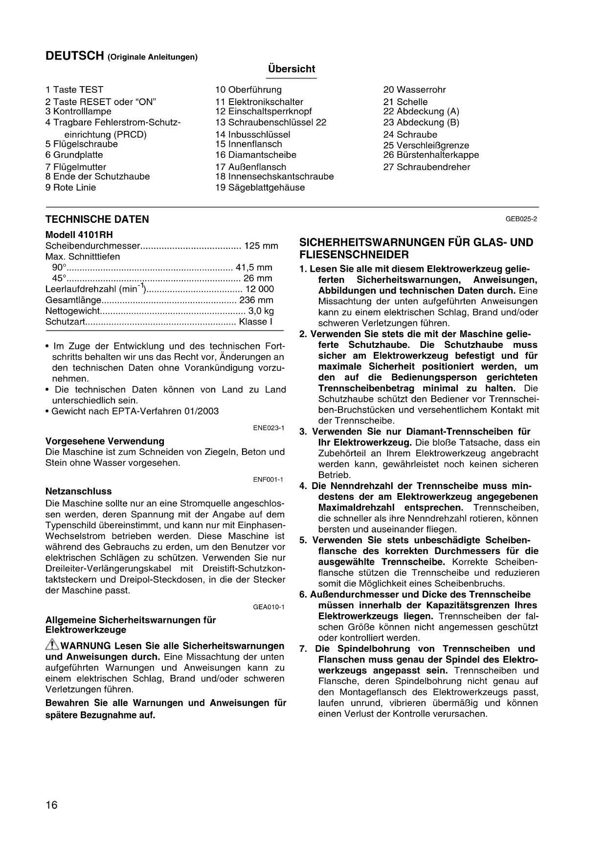 - Gewicht nach EPTA-Verfahren 01/2003 ENE023-1 Vorgesehene Verwendung Die Maschine ist zum Schneiden von Ziegeln, Beton und Stein ohne Wasser vorgesehen. ENF001-1 Netzanschluss Die Maschine sollte nur an eine Stromquelle angeschlos- sen werden, deren Spannung mit der Angabe auf dem Typenschild übereinstimmt, und kann nur mit Einphasen- Wechselstrom betrieben werden. Diese Maschine ist während des Gebrauchs zu erden, um den Benutzer vor elektrischen Schlägen zu schützen. Verwenden Sie nur Dreileiter-Verlängerungskabel mit Dreistift-Schutzkon- taktsteckern und Dreipol-Steckdosen, in die der Stecker der Maschine passt. GEA010-1 Allgemeine Sicherheitswarnungen für Elektrowerkzeuge WARNUNG Lesen Sie alle Sicherheitswarnungen und Anweisungen durch. Eine Missachtung der unten aufgeführten Warnungen und Anweisungen kann zu einem elektrischen Schlag, Brand und/oder schweren Verletzungen führen. Bewahren Sie alle Warnungen und Anweisungen für spätere Bezugnahme auf. GEB025-2