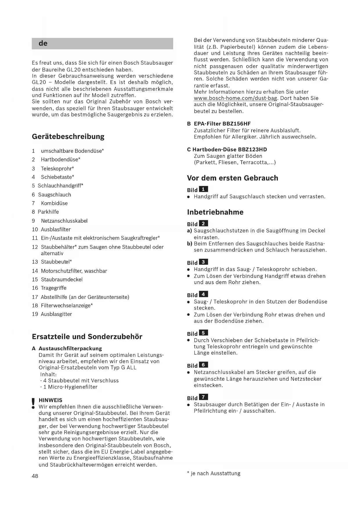 Es freut uns, dass Sie sich für einen Bosch Staubsauger der Baureihe GL20 entschieden haben. In dieser Gebrauchsanweisung werden verschiedene GL20 – Modelle dargestellt. Es ist deshalb möglich, dass nicht alle beschriebenen Ausstattungsmerkmale und Funktionen auf Ihr Modell zutreffen. Sie sollt en nur das Original Zubehör von Bosch ver- wenden, das speziell für Ihren Staubsauger entwickelt wurde, um das bestmögliche Saugergebnis zu erzielen. Gerätebeschreibung 1 umschaltbare Bodendüse* 2 Hartbodendüse* 3 Teleskoprohr* 4 Schiebetaste* 5 Schlauchhandgriff* 6 Saugschlauch 7 Kombidüse 8 Parkhilfe 9 Netzanschlusskabel 10 Ausblasfilter 11 Ein-/Austaste mit elektronischem Saugkraftregler* 12 Staubbehälter* zum Saugen ohne Staubbeutel oder alternativ 13 Staubbeut el* 14 Motorschutzfilter, waschbar 15 Staubraumdeckel 16 Tragegriffe 17 Abstellhilfe (an der Geräteunterseite) 18 Filterwechselanzeige* 19 Ausblasgitter Ersatzteile und Sonderzubehör A Austauschfilterpackung Damit Ihr Gerät auf seinem optimalen Leistungs- niveau arbeitet, empfehlen wir den Einsatz von Original-Ersatzbeuteln vom Typ G ALL Inhalt: - 4 Staubbeutel mit Verschluss - 1 Micro-Hygienefilter