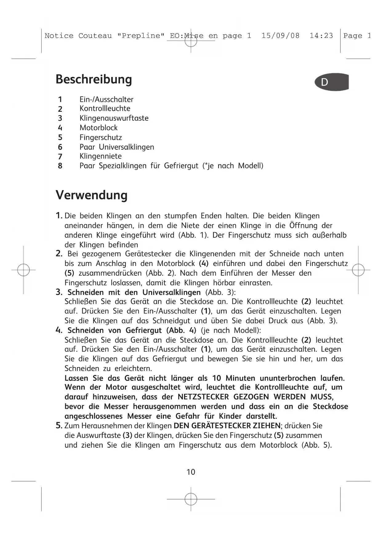 Notice Couteau "Prepline" EO:Mise en page 1 15/09/08 14:23 Page 11• Tauchen Sie das Gerät, Zuleitung und den Stecker nicht in Wasser oder andere Flüssigkeiten.