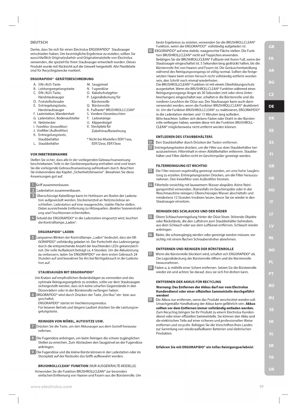 UADEUTSCH Danke, dass Sie sich für einen Electrolux ERGORAPIDO® Staubsauger entschieden haben. Um bestmögliche Ergebnisse zu erzielen, sollten Sie ausschließlich Originalzubehör und Originalersatzteile von Electrolux verwenden, die speziell für Ihren Staubsauger entwickelt wurden. Dieses Produkt wurde mit Rücksicht auf die Umwelt hergestellt. Alle Plastikteile sind für Recyclingzwecke markiert.