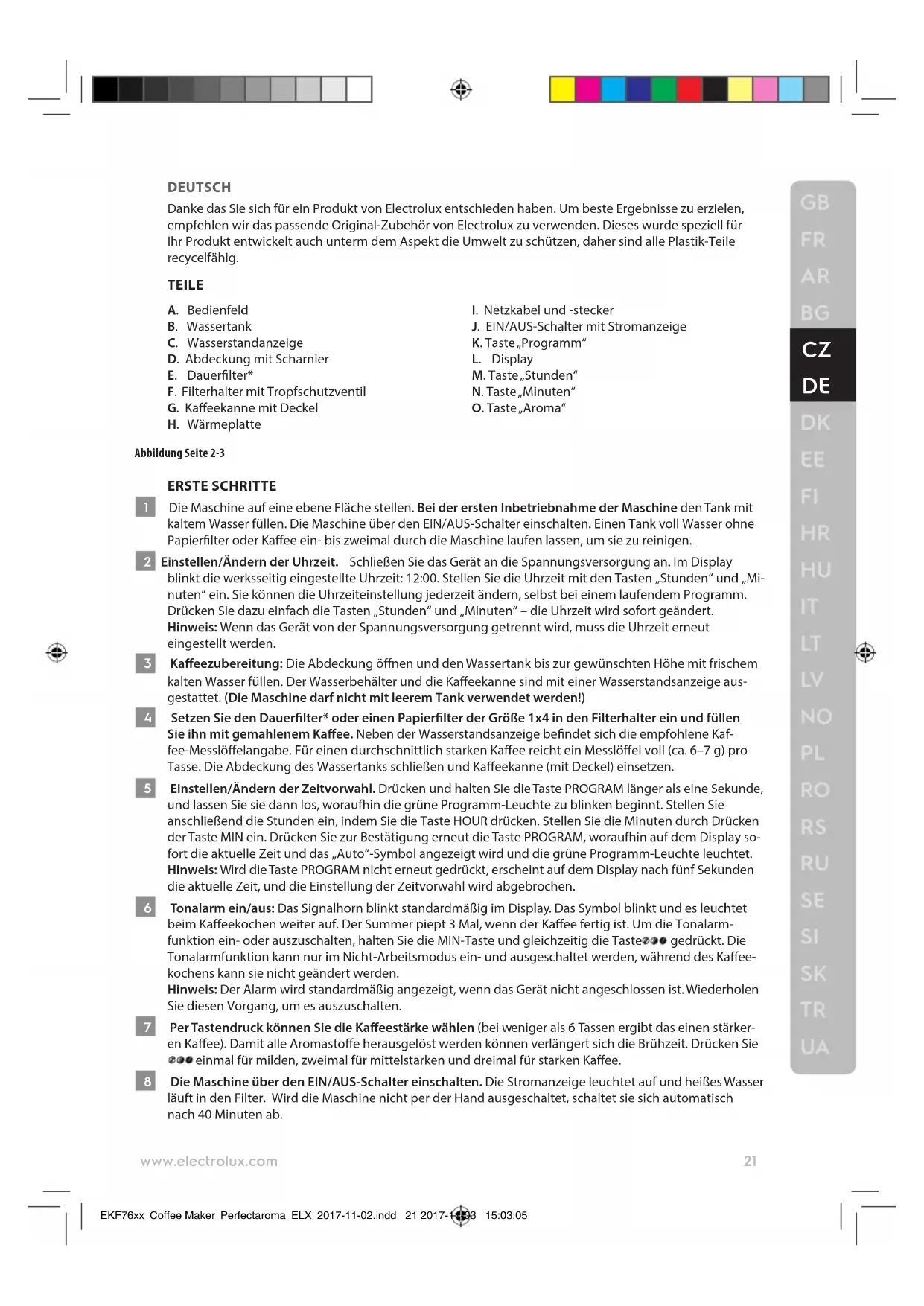 - Das Gerät darf nur mit einer geerdeten Steckdose verbunden werden. Falls notwendig EKF76xx_Coffee Maker_Perfectaroma_ELX_2017-11-02.indd 22 2017-11-03 15:03:0523 www.electrolux.com