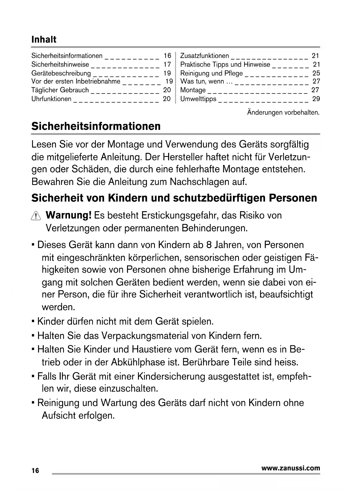 www.zanussi.comInhalt Sicherheitsinformationen _ _ _ _ _ _ _ _ _ _ 16 Sicherheitshinweise _ _ _ _ _ _ _ _ _ _ _ _ _ 17 Gerätebeschreibung _ _ _ _ _ _ _ _ _ _ _ _ 19 Vor der ersten Inbetriebnahme _ _ _ _ _ _ _ 19 Täglicher Gebrauch _ _ _ _ _ _ _ _ _ _ _ _ _ 20 Uhrfunktionen _ _ _ _ _ _ _ _ _ _ _ _ _ _ _ _ 20 Zusatzfunktionen _ _ _ _ _ _ _ _ _ _ _ _ _ _ _ 21 Praktische Tipps und Hinweise _ _ _ _ _ _ _ 21 Reinigung und Pflege _ _ _ _ _ _ _ _ _ _ _ _ 25 Was tun, wenn … _ _ _ _ _ _ _ _ _ _ _ _ _ _ 27 Montage _ _ _ _ _ _ _ _ _ _ _ _ _ _ _ _ _ _ _ 27 Umwelttipps _ _ _ _ _ _ _ _ _ _ _ _ _ _ _ _ _ 29 Änderungen vorbehalten. Sicherheitsinformationen Lesen Sie vor der Montage und Verwendung des Geräts sorgfältig die mitgelieferte Anleitung. Der Hersteller haftet nicht für Verletzun- gen oder Schäden, die durch eine fehlerhafte Montage entstehen. Bewahren Sie die Anleitung zum Nachschlagen auf. Sicherheit von Kindern und schutzbedürftigen Personen Warnung! Es besteht Erstickungsgefahr, das Risiko von Verletzungen oder permanenten Behinderungen.
