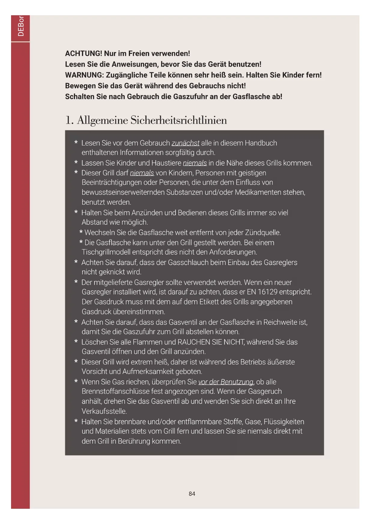 - 6. Umweltleitfaden, Gewährleistungsbedingungen und Kontaktinformationen ..... 10784 DEBoretti Ibrido / Benutzerhandbuch – Installationshinweise ACHTUNG! Nur im Freien verwenden! Lesen Sie die Anweisungen, bevor Sie das Gerät benutzen! WARNUNG: Zugängliche Teile können sehr heiß sein. Halten Sie Kinder fern! Bewegen Sie das Gerät während des Gebrauchs nicht! Schalten Sie nach Gebrauch die Gaszufuhr an der Gasflasche ab!