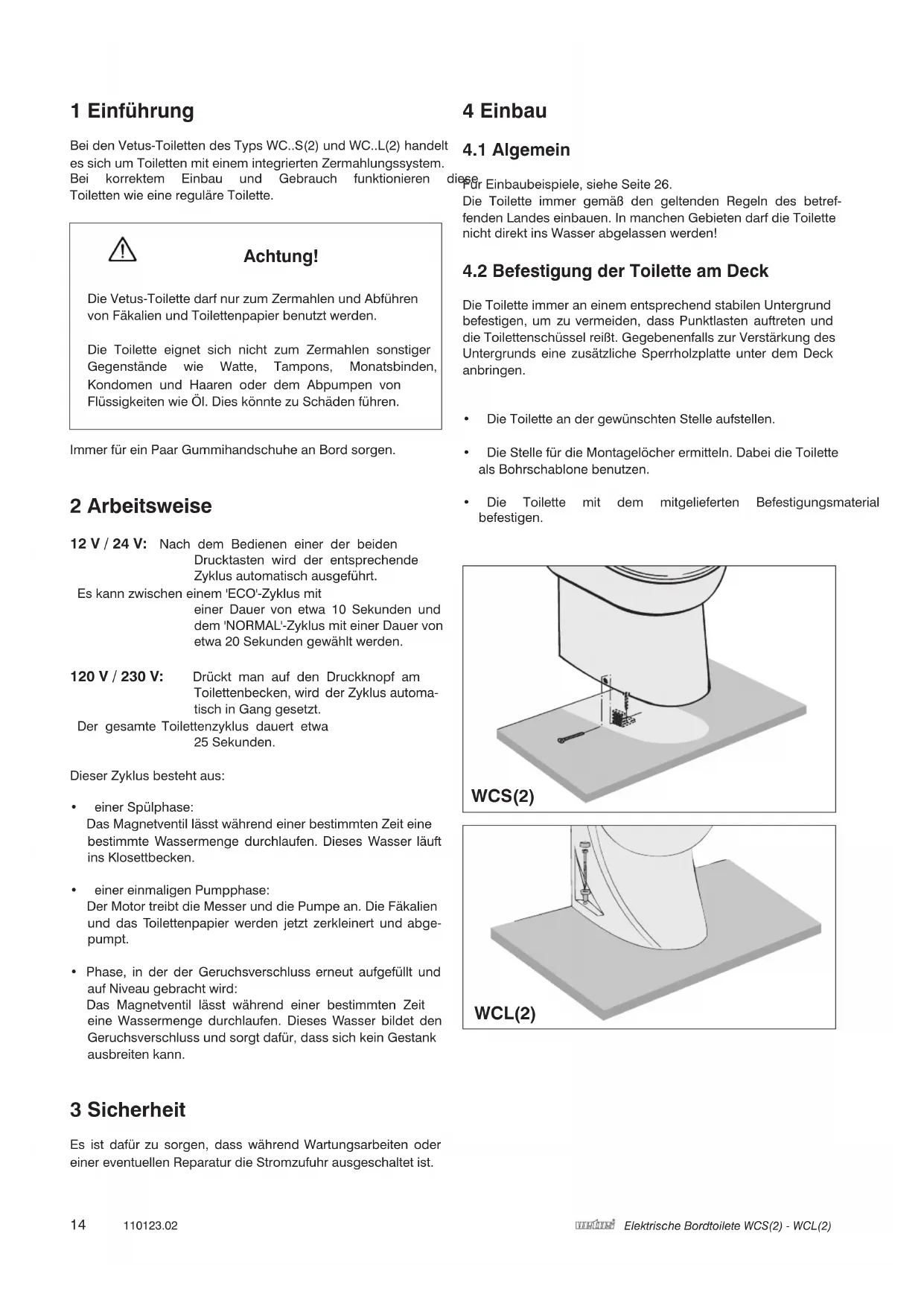- Ensureaminimumwaterpressure of 1.5Bar(24psi). 12 V / 24 V120 V / 230 V 12 V / 24 V 120 V / 230 V ENGLISH14 110123.02 Elektrische Bordtoilete WCS(2) - WCL(2) 1 Einführung Bei den Vetus-Toiletten des Typs WC..S(2) und WC..L(2) handelt es sich um Toiletten mit einem integrierten Zermahlungssystem. Bei korrektem Einbau und Gebrauch funktionieren diese Toiletten wie eine reguläre Toilette.