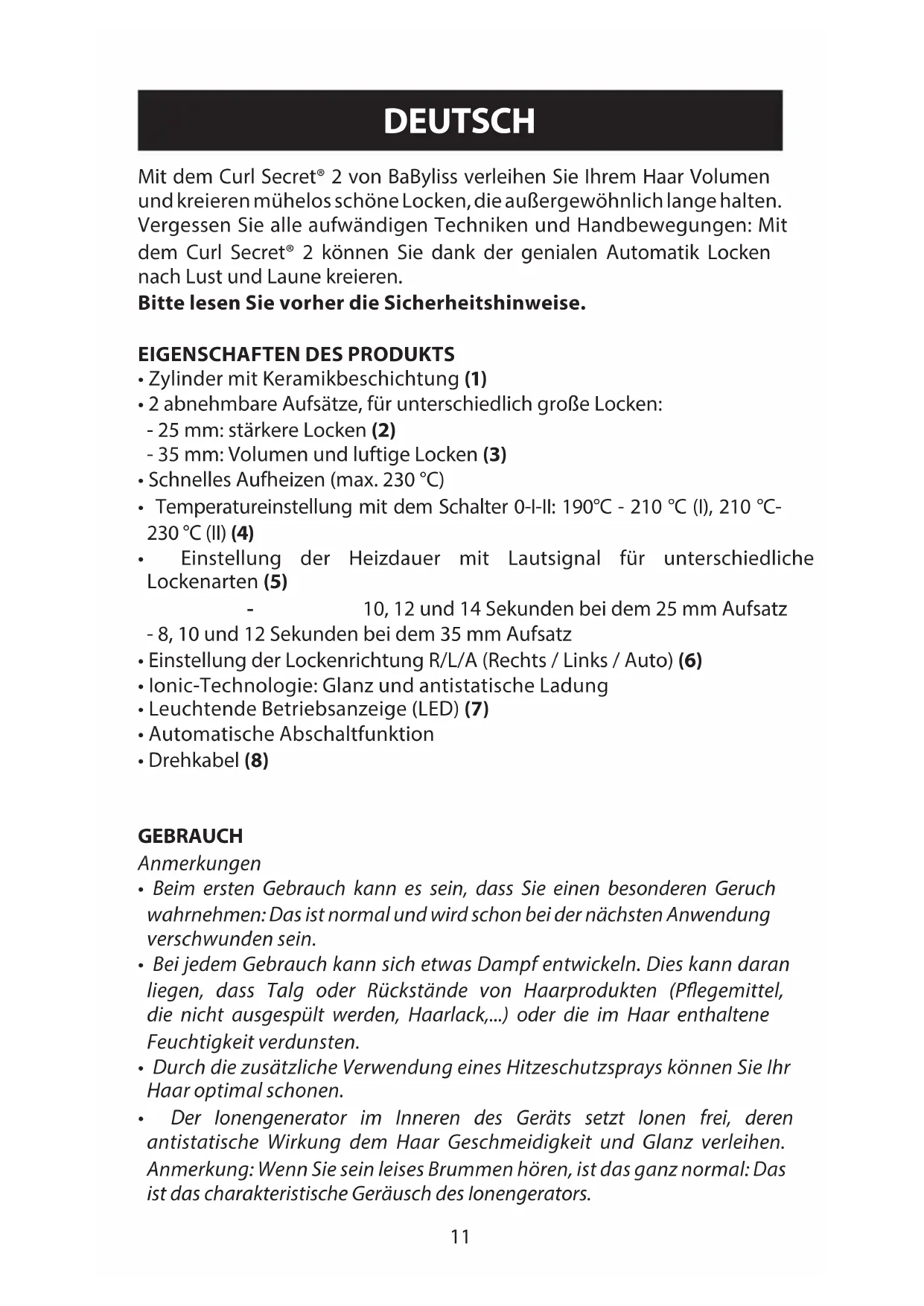 Once unplugged and cooled, the appliance housing may be wiped down with a damp cloth. Ensure the appliance is completely dry before plugging it in again. RC-16_C1300E-no tool_IB.indd 10 18/08/16 09:0911 Mit dem Curl Secret® 2 von BaByliss verleihen Sie Ihrem Haar Volumen und kreieren mühelos schöne Locken, die außergewöhnlich lange halten. Vergessen Sie alle aufwändigen Techniken und Handbewegungen: Mit dem Curl Secret® 2 können Sie dank der genialen Automatik Locken nach Lust und Laune kreieren. Bitte lesen Sie vorher die Sicherheitshinweise.